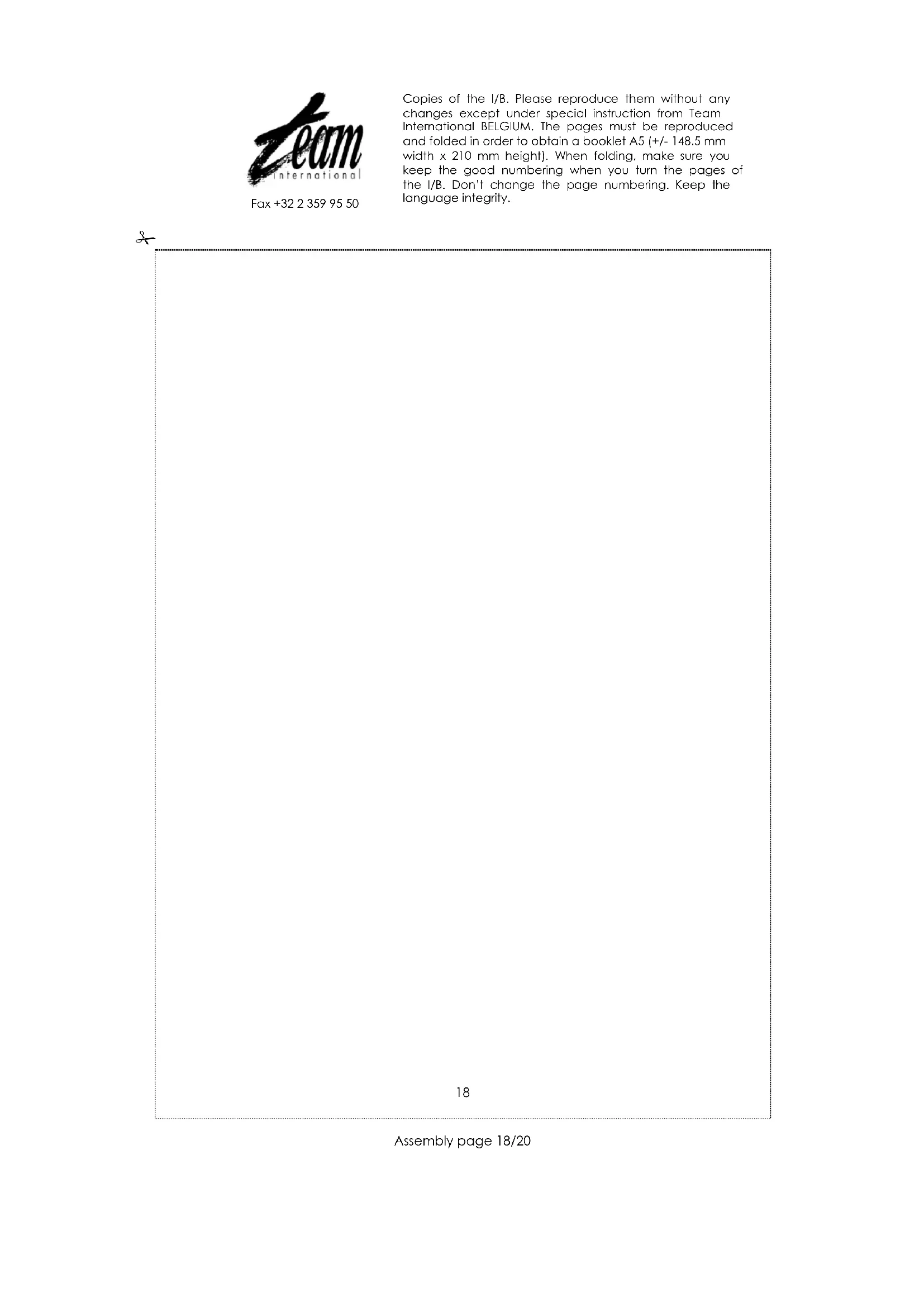 Fax +32 2 359 95 50 Copies of the I/B. Please reproduce them without any changes except under special instruction from Team International BELGIUM. The pages must be reproduced and folded in order to obtain a booklet A5 (+/- 148.5 mm width x 210 mm height). When folding, make sure you keep the good numbering when you turn the pages of the I/B. Don’t change the page numbering. Keep the language integrity.
