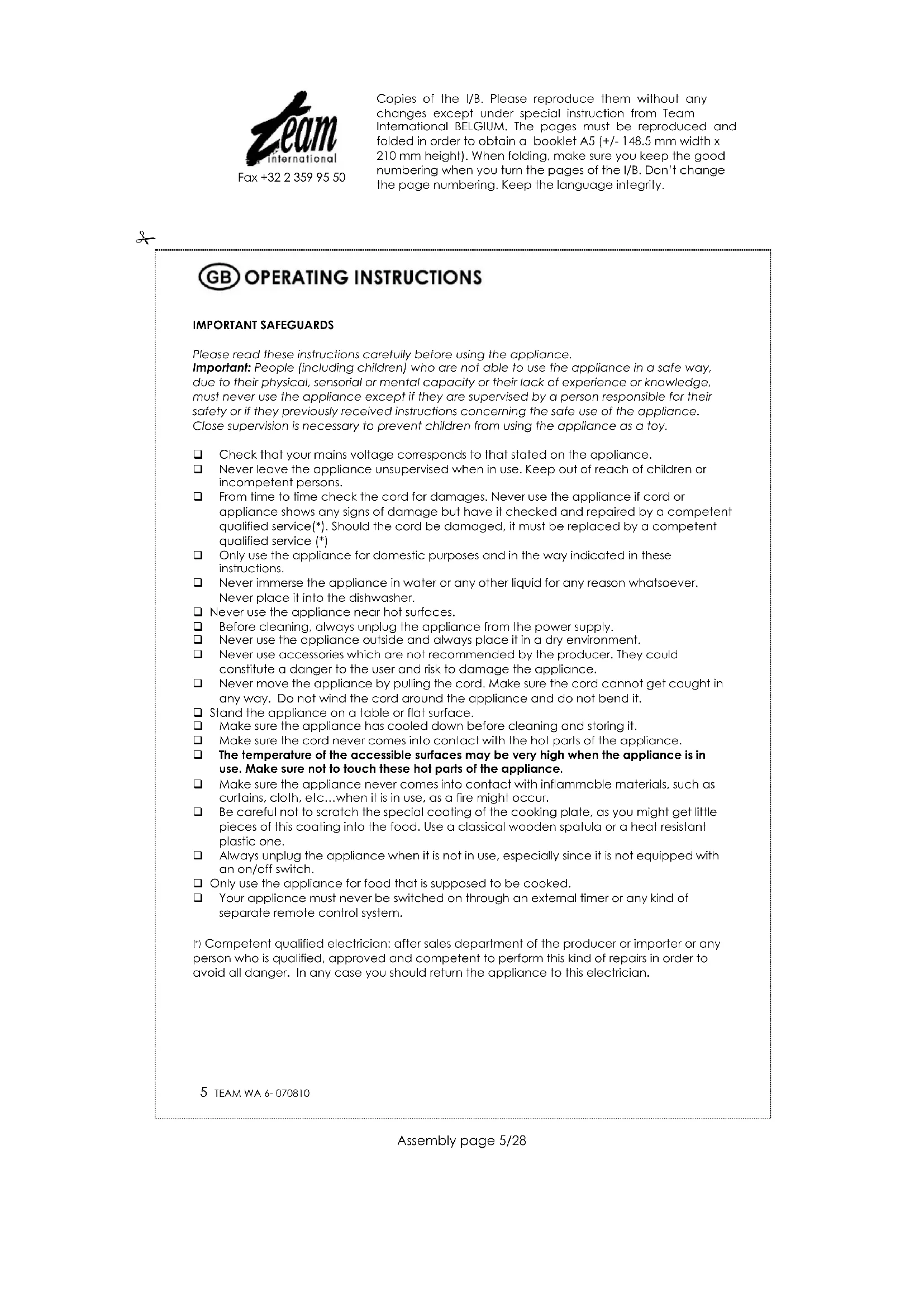 Fax +32 2 359 95 50 Copies of the I/B. Please reproduce them without any changes except under special instruction from Team International BELGIUM. The pages must be reproduced and folded in order to obtain a booklet A5 (+/- 148.5 mm width x 210 mm height). When folding, make sure you keep the good numbering when you turn the pages of the I/B. Don’t change the page numbering. Keep the language integrity.