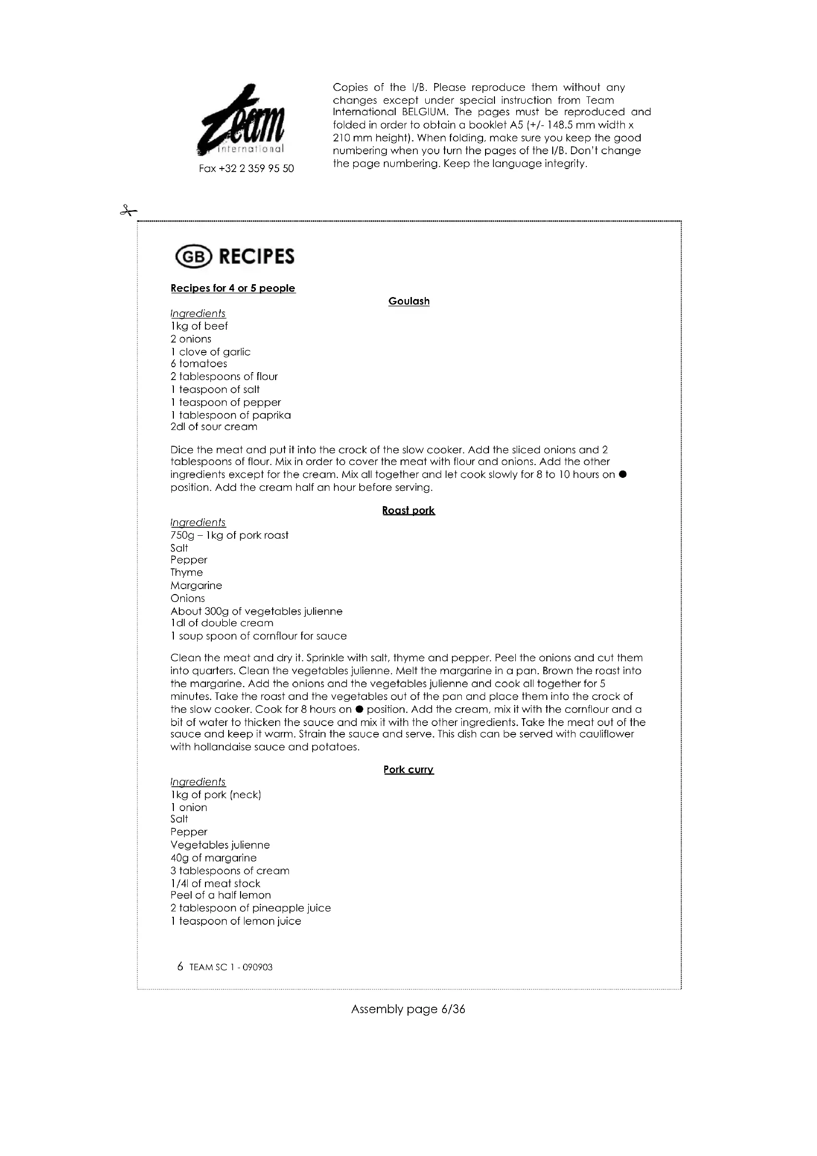 Fax +32 2 359 95 50 Stuffed cabbage Ingredients 1 white cabbage 750g of minced beef 250 of minced pork 2 teaspoons of salt Milk Pepper Paprika Cumin Nutmeg 1 bread roll 2 eggs 2 onions 2 tomatoes 1dl of sour cream 1 tablespoon of corn flour for sauce Put the cabbage into salty boiling water for about 5 minutes. Soften the bread into a bit of milk and mix it with the other ingredients and the minced meat. Detach some cabbage leaves. Prepare some meatballs and roll them into the cabbage leaves. Put the stuffed cabbage into the crock of the slow cooker. Peel the onions and cut them into halves. Do the same with the tomatoes. Put the whole into the crock of the slow cooker. (If you’d like to get a lot of sauce, add 1 to 2 cups of cabbage juices just before serving.) After 8 to 10 hours of cooking on position, take the cabbage out of the crock. Mix the cream and the corn flour for sauce and serve. Roast veal Ingredients 1kg-1.5 kg of veal roast Thyme Sage Salt Pepper Vegetables julienne 1 onion Double cream 1 tablespoon of corn flour for sauce Clean the meat and dry it. Sprinkle with salt, pepper, thyme and sage. Clean the vegetables julienne. Peel and slice the onions thinly. Put the mixture into the crock of the slow cooker. Put the meat on the vegetables. Cook for 8 hours on position. Take the meat out of the crock and keep it hot. Add the cream to the cooking juices in the crock of the slow cooker and the corn flour to thicken the sauce. Strain the sauce before serving. Copies of the I/B. Please reproduce them without any changes except under special instruction from Team International BELGIUM. The pages must be reproduced and folded in order to obtain a booklet A5 (+/- 148.5 mm width x 210 mm height). When folding, make sure you keep the good numbering when you turn the pages of the I/B. Don’t change the page numbering. Keep the language integrity.