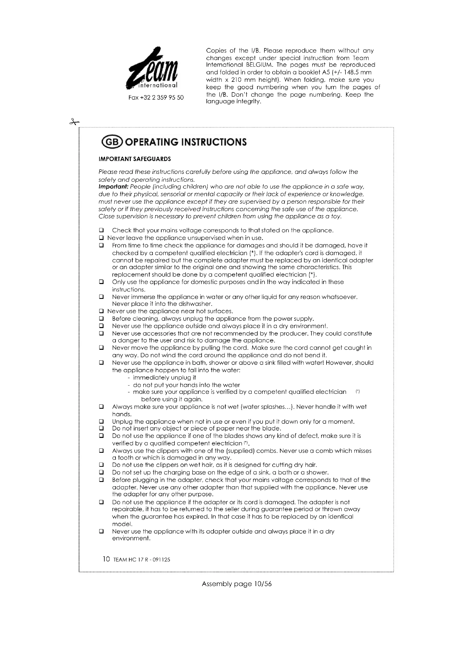 □ Always use the clippers with one of the (supplied) combs. Never use a comb which misses a tooth or which is damaged in any way.