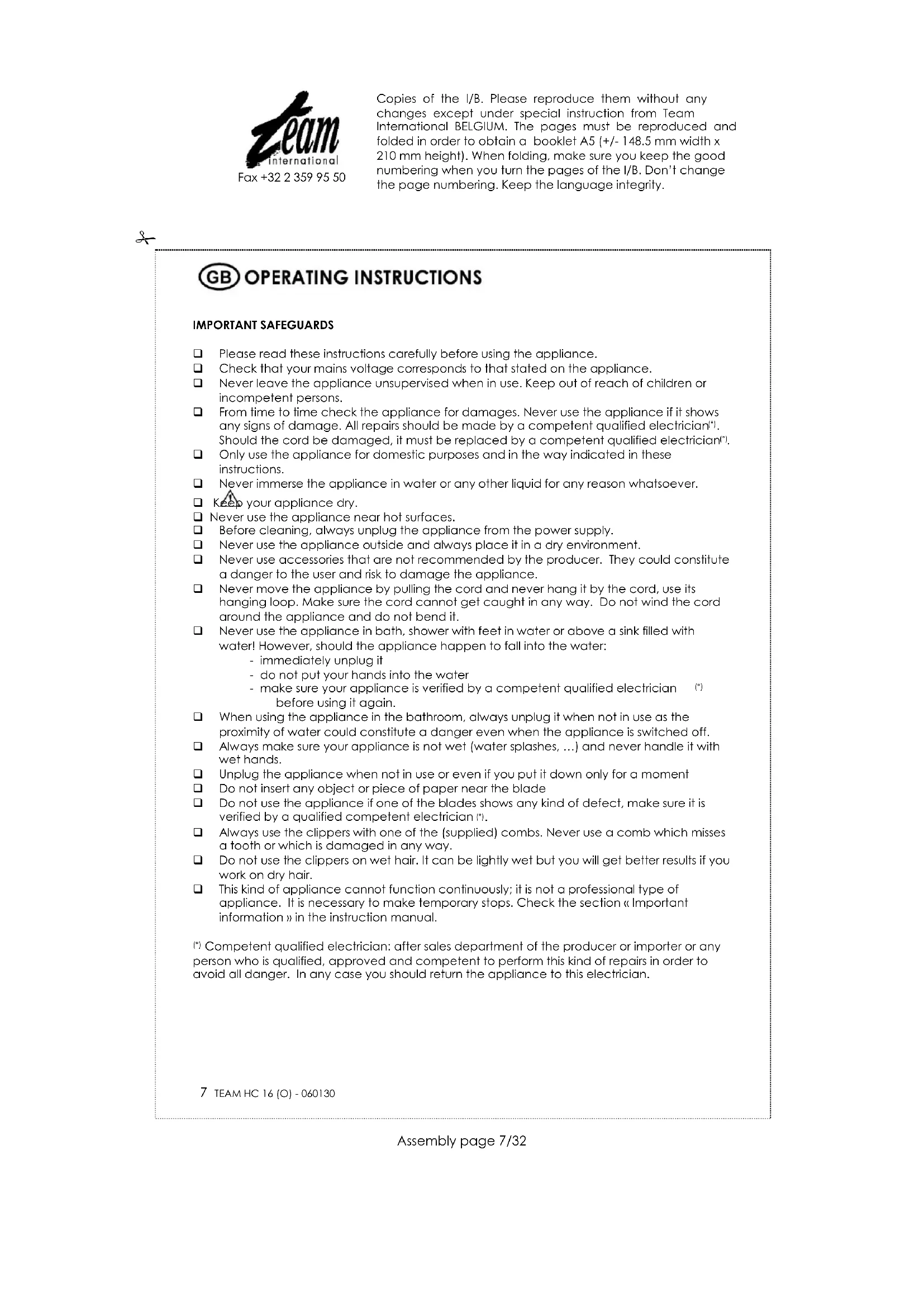 Haarschneideset Hair Clipper Tondeuse Tondeuse Maquinilla De Cortar El Pelo Máquina De Cortar Cabelo Tagliacapelli TEAM HC 16 (O) 230 V ~ 10 W I/B Version 060130 Copies of the I/B. Please reproduce them without any changes except under special instruction from Team International BELGIUM. The pages must be reproduced and folded in order to obtain a booklet A5 (+/- 148.5 mm width x 210 mm height). When folding, make sure you keep the good numbering when you turn the pages of the I/B. Don’t change the page numbering. Keep the language integrity.