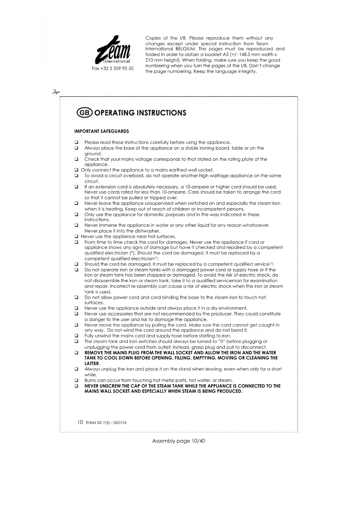 Fax +32 2 359 95 50 (E.g. an article consisting of “60% polyester and 40% cotton” should be ironed at the temperature indicated for polyester and without steam). If you do not know what kind(s) of fabric(s) the article has been made of, find a spot, which will be invisible when wearing or using the article to try out the ironing temperature. (Always start at a low temperature and increase to one, which gives the required results). Pure woollen fabrics (100% wool) may be pressed with the iron set to a steam position. It is recommended to apply shot-of-steam and use a dry pressing cloth. When steam-ironing woollen fabrics, shining of the fabric may occur. This can be prevented by turning the article inside out and ironing the inside or by interposing a light damp cloth. Velvet and other textures that rapidly acquire shiny spots should be ironed in one direction only (with the nap), applying only light pressure. Always keep the iron moving. Iron the reverse side of synthetic materials and silk, it is not advisable to use steam as this may cause stains. FILLING WITH WATER (FOR STEAM-IRONING) Make sure the main plug is unplugged from the wall socket. Switch off the iron by pressing its switch to the OFF-position (side without the dot). Switch off the steam tank by pressing its switch to the OFF-position (side without the dot). Position the base of the appliance on a stable flat surface and unscrew the cap (if you left water in the tank and the cap screwed, a light degazing will happen during the next use. It‟s normal and presents no danger). Fill the steam tank with water (max. 1 litre). You can use tap water, however, if the water is very hard, it is advisable to use distilled water. Never use vinegar, descaling agents or other chemicals. Close the steam tank by turning the screw cap clockwise by hand (see page 4). WHILE IRONING CAUTION : WHEN THE APPLIANCE IS IN OPERATION, THE STEAM TANK WILL BE UNDER PRESSURE WITH HOT STEAM. FIRST OF ALL BE SURE THAT THERE IS NO MORE STEAM IN THE WATER TANK. THE BASE AND THE IRON ARE ALWAYS UNDER PRESSURE, BLEED THE TANK BY PUSHING THE BUTTON (E) UNTIL NO MORE STEAM ESCAPES, THEN SWITCH OFF THE BASE AND THE IRON (SWITCHES AND IN OFF-POSITION). CAREFULLY UNSCREW THE CAP IN ORDER TO CHECK IF THERE IS NO MORE STEAM AND THEN UNSCREW IT COMPLETELY. LET THE TANK A FEW MINUTES COOL DOWN AND THE FILL IT AGAIN. ATTENTION: IF YOU FILL TOO EARLY, STEAM OR HOT WATER WILL ESCAPE FROM THE OPENING. WE ADVISE YOU TO PROCEED SLOWLY WHEN YOU FILL IN EVEN AT THE BEGINNING. FINALLY CLOSE THE WATER TANK WITH THE CAP. YOUR APPLIANCE IS READY TO OPERATE. STEAM-IRONING As indicated on the temperature dial (G) and the table, steam ironing is only possible at higher ironing temperatures, so set the dial to or . Fill the water tank with water and insert the mains plug into a wall socket. Copies of the I/B. Please reproduce them without any changes except under special instruction from Team International BELGIUM. The pages must be reproduced and folded in order to obtain a booklet A5 (+/- 148.5 mm width x 210 mm height). When folding, make sure you keep the good numbering when you turn the pages of the I/B. Don‟t change the page numbering. Keep the language integrity.