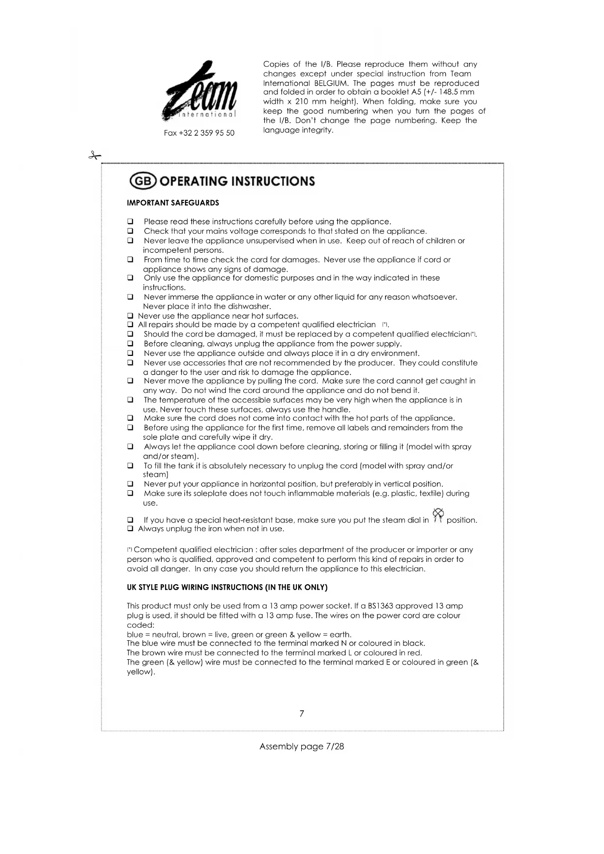 Competent qualified electrician : after sales department of the producer or importer or any person who is qualified, approved and competent to perform this kind of repairs in order to avoid all danger. In any case you should return the appliance to this electrician. UK STYLE PLUG WIRING INSTRUCTIONS (IN THE UK ONLY) This product must only be used from a 13 amp power socket. If a BS1363 approved 13 amp plug is used, it should be fitted with a 13 amp fuse. The wires on the power cord are colour coded: blue = neutral, brown = live, green or green & yellow = earth. The blue wire must be connected to the terminal marked N or coloured in black. The brown wire must be connected to the terminal marked L or coloured in red. The green (& yellow) wire must be connected to the terminal marked E or coloured in green (& yellow). Copies of the I/B. Please reproduce them without any changes except under special instruction from Team International BELGIUM. The pages must be reproduced and folded in order to obtain a booklet A5 (+/- 148.5 mm width x 210 mm height). When folding, make sure you keep the good numbering when you turn the pages of the I/B. Don‟t change the page numbering. Keep the language integrity.