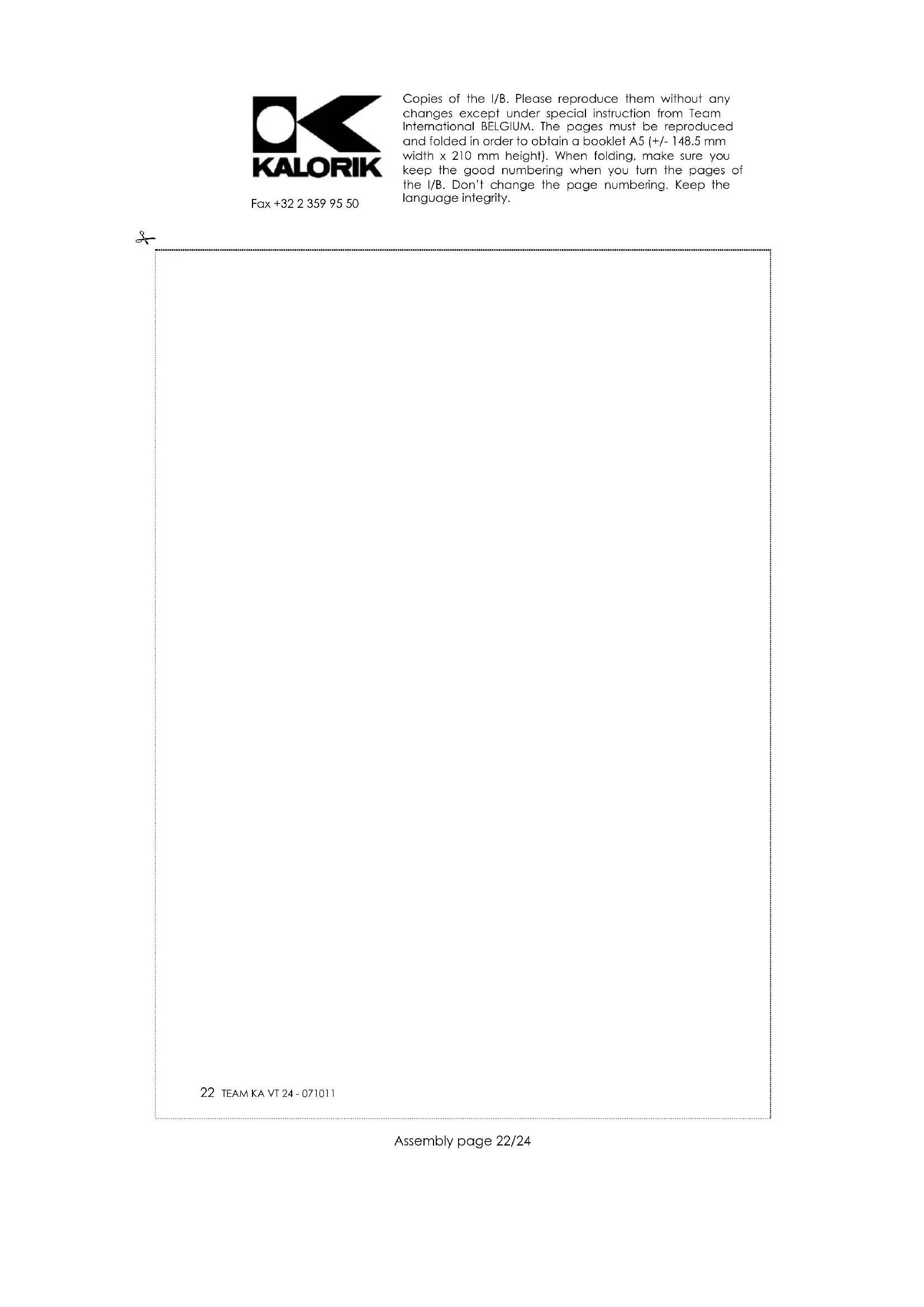 Fax +32 2 359 95 50 Copies of the I/B. Please reproduce them without any changes except under special instruction from Team International BELGIUM. The pages must be reproduced and folded in order to obtain a booklet A5 (+/- 148.5 mm width x 210 mm height). When folding, make sure you keep the good numbering when you turn the pages of the I/B. Don’t change the page numbering. Keep the language integrity.