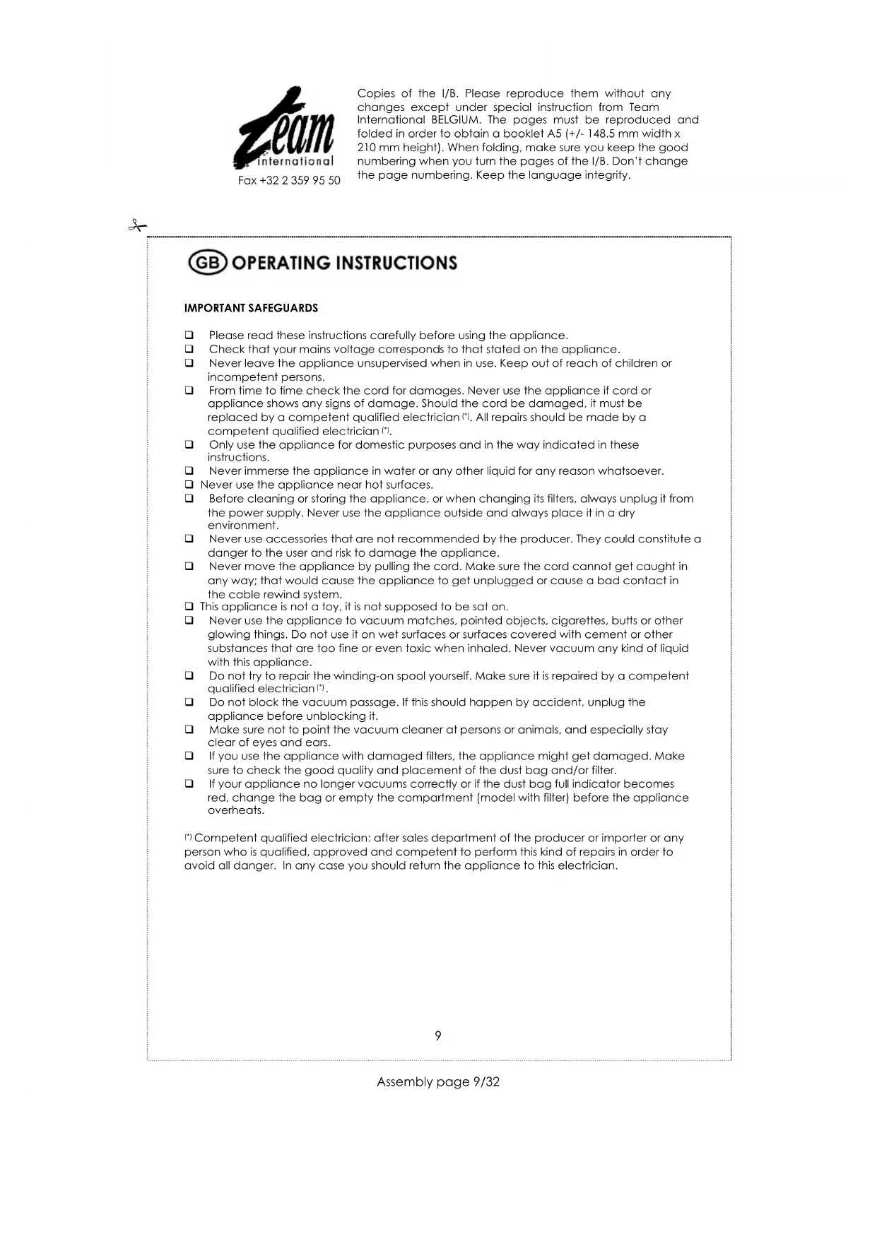 Fax +32 2 359 95 50 Copies of the I/B. Please reproduce them without any changes except under special instruction from Team International BELGIUM. The pages must be reproduced and folded in order to obtain a booklet A5 (+/- 148.5 mm width x 210 mm height). When folding, make sure you keep the good numbering when you turn the pages of the I/B. Don’t change the page numbering. Keep the language integrity.