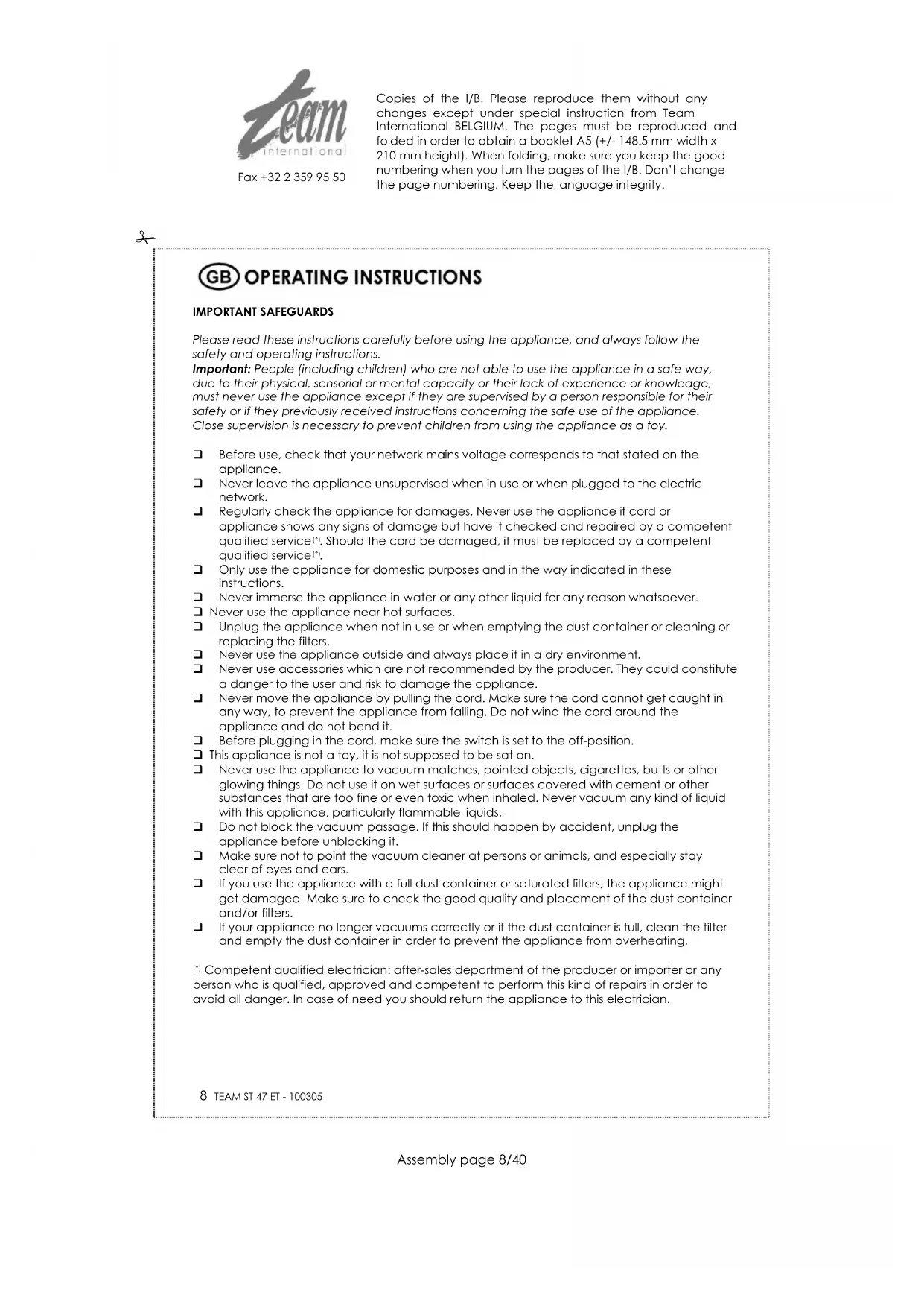 Filters The filter system consists of: 1 accordion filter to vacuum the smallest particles (in the dust container) 1 nylon filter (around the accordion filter) 1 air filter, to vacuum the smallest particles (at the back of the appliance) It is necessary to clean the filters regularly to avoid operating problems. Copies of the I/B. Please reproduce them without any changes except under special instruction from Team International BELGIUM. The pages must be reproduced and folded in order to obtain a booklet A5 (+/- 148.5 mm width x 210 mm height). When folding, make sure you keep the good numbering when you turn the pages of the I/B. Don‟t change the page numbering. Keep the language integrity.