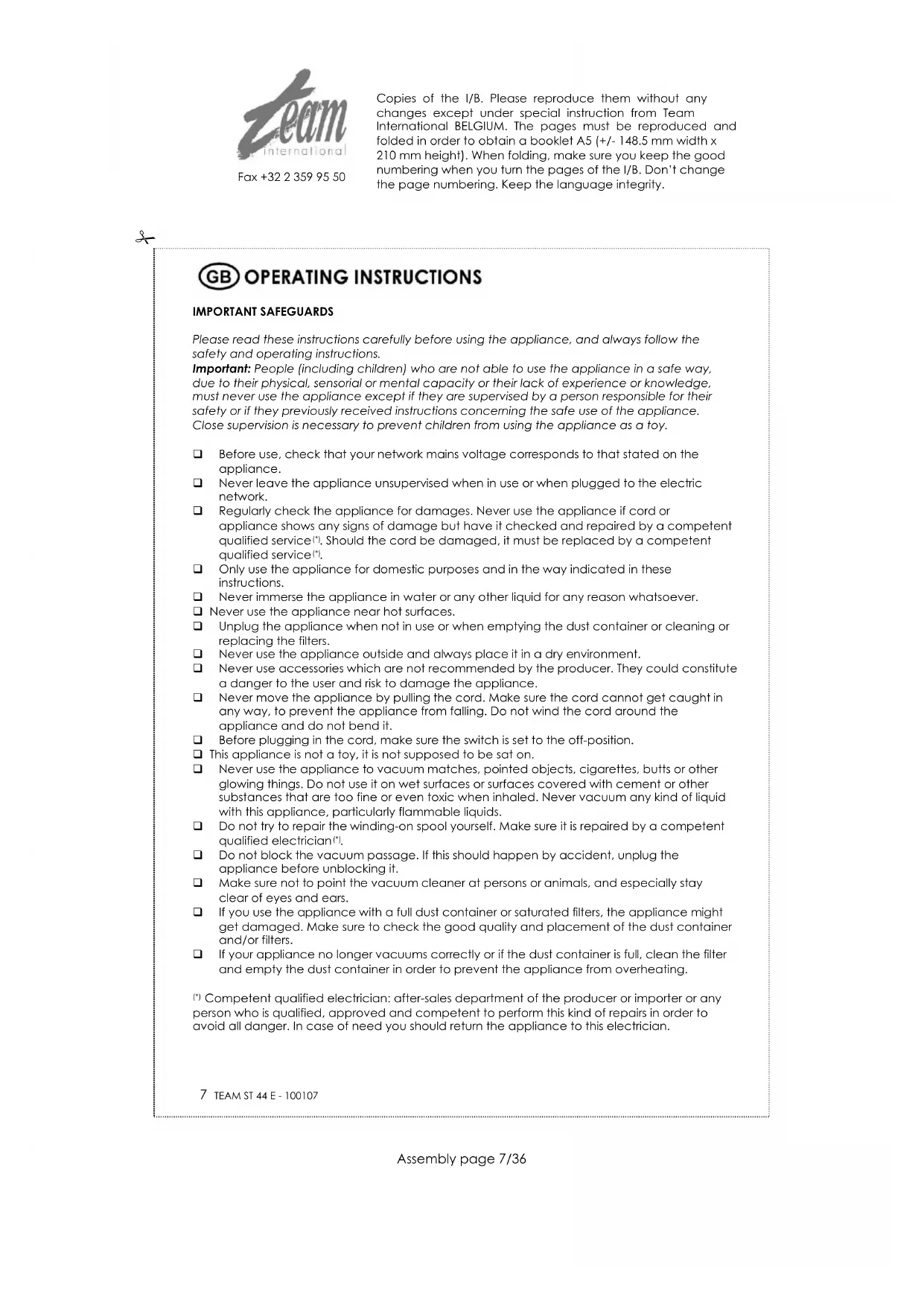 Download the instructions for your Vacuum Cleaner in PDF format for free! Find your manual ST 44 - TEAM and take your electronic device back in hand. On this page are published all the documents necessary for the use of your device. ST 44 by TEAM.