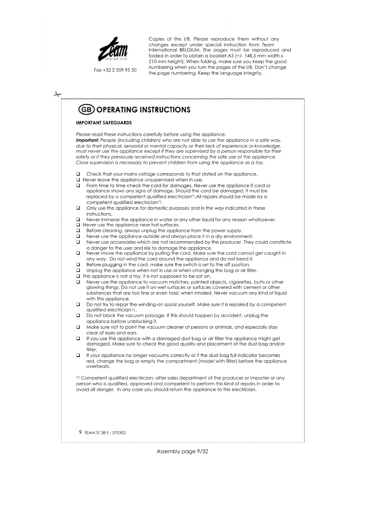 Fax +32 2 359 95 50 Copies of the I/B. Please reproduce them without any changes except under special instruction from Team International BELGIUM. The pages must be reproduced and folded in order to obtain a booklet A5 (+/- 148.5 mm width x 210 mm height). When folding, make sure you keep the good numbering when you turn the pages of the I/B. Don’t change the page numbering. Keep the language integrity.