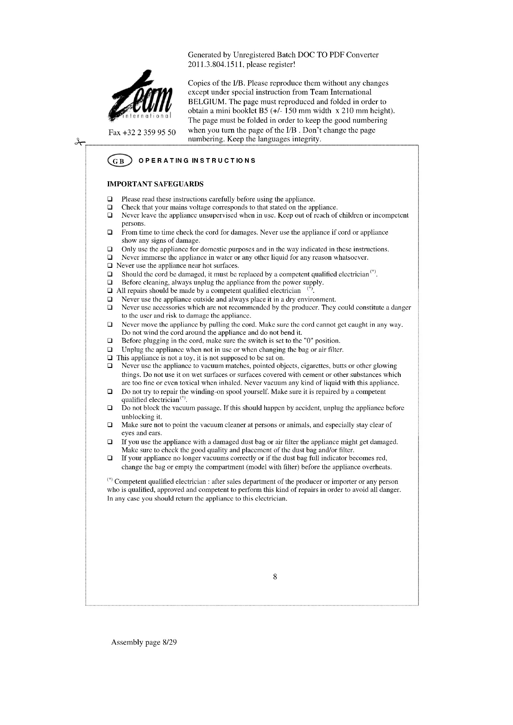 Competent qualified electrician : after sales department of the producer or importer or any person who is qualified, approved and competent to perform this kind of repairs in order to avoid all danger. In any case you should return the appliance to this electrician.Generated by Unregistered Batch DOC TO PDF Converter 2011.3.804.1511, please register! Copies of the I/B. Please reproduce them without any changes except under special instruction from Team International BELGIUM. The page must reproduced and folded in order to obtain a mini booklet B5 (+/- 150 mm width x 210 mm height). The page must be folded in order to keep the good numbering when you turn the page of the I/B . Don‟t change the page numbering. Keep the languages integrity.
