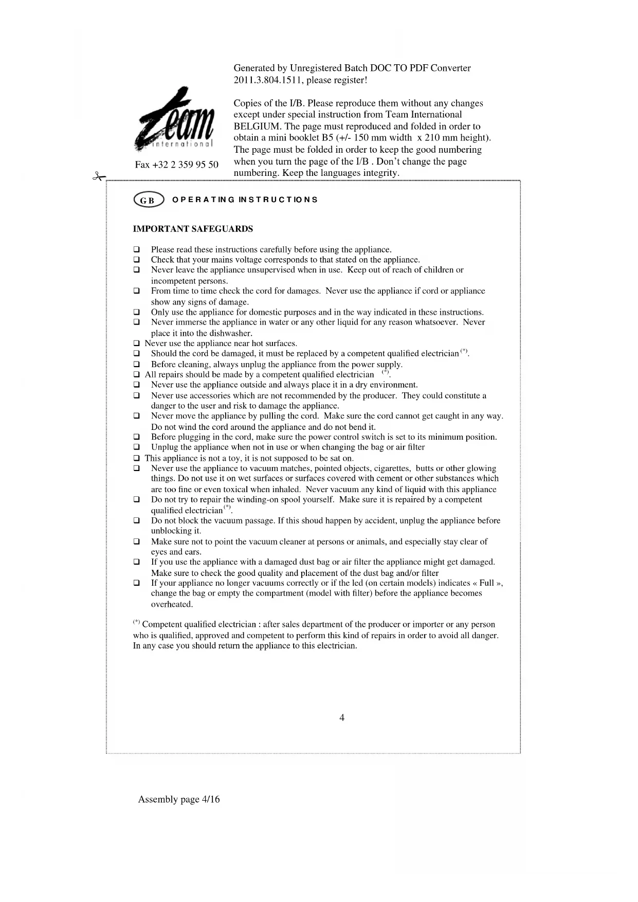 Competent qualified electrician : after sales department of the producer or importer or any person who is qualified, approved and competent to perform this kind of repairs in order to avoid all danger. In any case you should return the appliance to this electrician.Generated by Unregistered Batch DOC TO PDF Converter 2011.3.804.1511, please register! Copies of the I/B. Please reproduce them without any changes except under special instruction from Team International BELGIUM. The page must reproduced and folded in order to obtain a mini booklet B5 (+/- 150 mm width x 210 mm height). The page must be folded in order to keep the good numbering when you turn the page of the I/B . Don’t change the page numbering. Keep the languages integrity.
