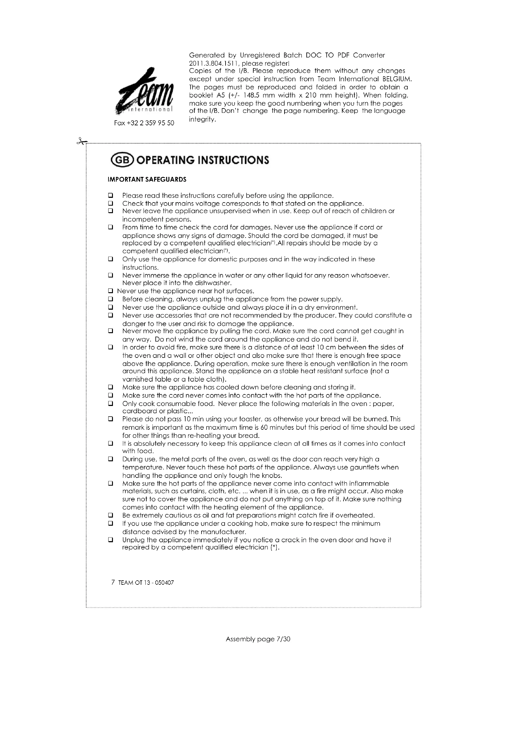 Fax +32 2 359 95 50 Generated by Unregistered Batch DOC TO PDF Converter 2011.3.804.1511, please register! Copies of the I/B. Please reproduce them without any changes except under special instruction from Team International BELGIUM. The pages must be reproduced and folded in order to obtain a booklet A5 (+/- 148.5 mm width x 210 mm height). When folding, make sure you keep the good numbering when you turn the pages of the I/B. Don’t change the page numbering. Keep the language integrity.
