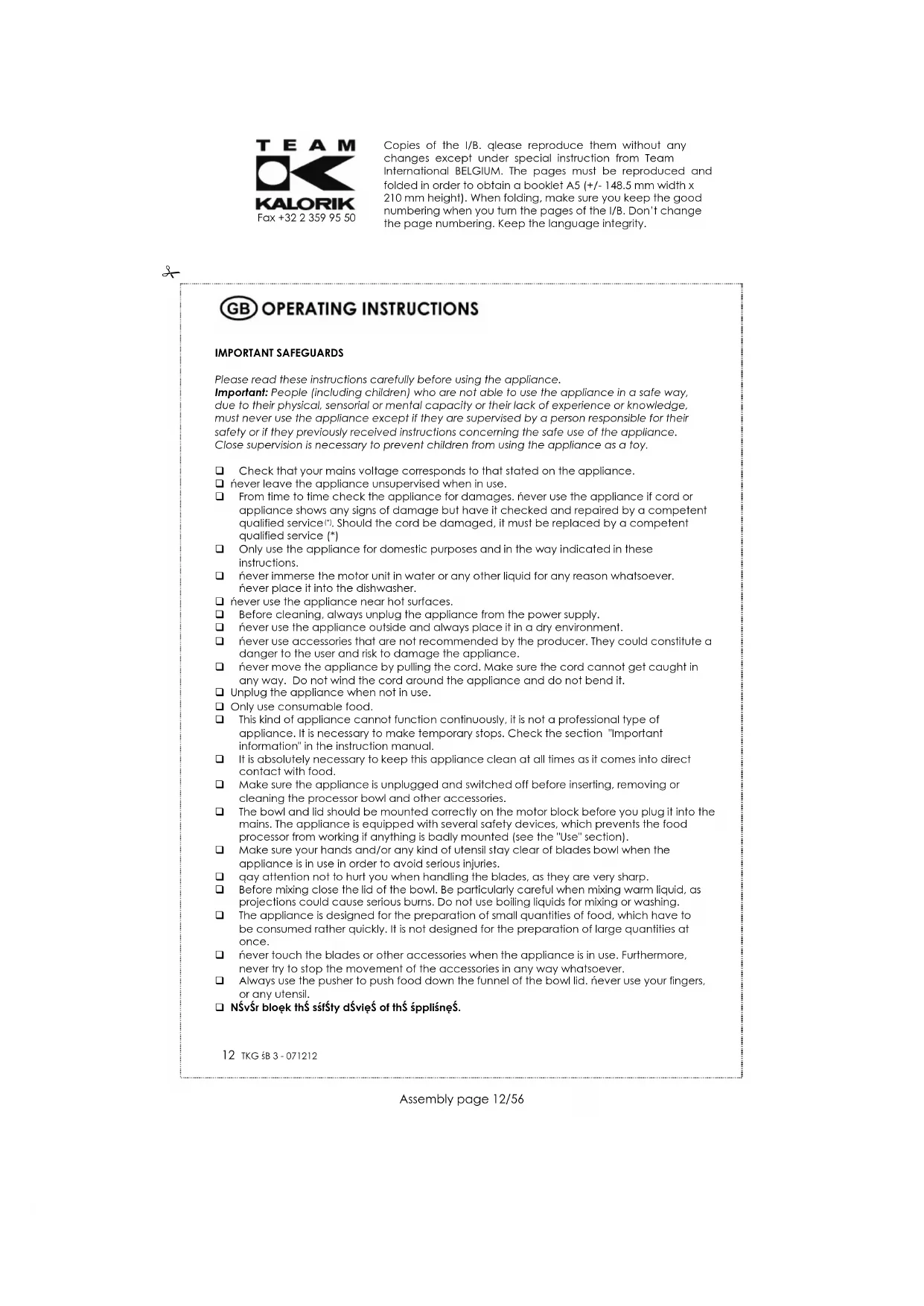 Copies of the I/B. Please reproduce them without any changes except under special instruction from Team International BELGIUM. The pages must be reproduced and folded in order to obtain a booklet A5 (+/- 148.5 mm width x 210 mm height). When folding, make sure you keep the good numbering when you turn the pages of the I/B. Don’t change the page numbering. Keep the language integrity.