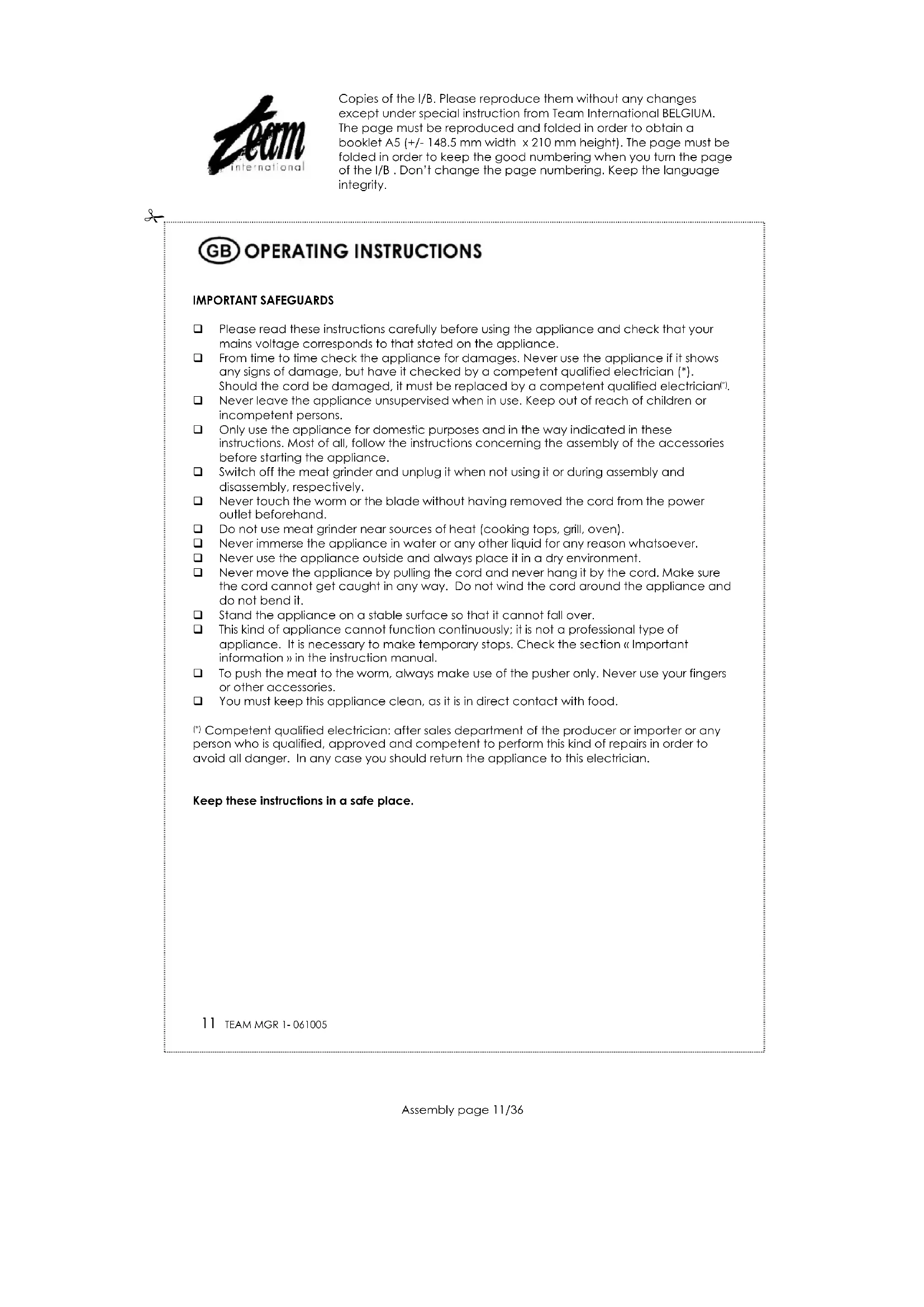 Keep these instructions in a safe place.Copies of the I/B. Please reproduce them without any changes except under special instruction from Team International BELGIUM. The page must be reproduced and folded in order to obtain a booklet A5 (+/- 148.5 mm width x 210 mm height). The page must be folded in order to keep the good numbering when you turn the page of the I/B . Don’t change the page numbering. Keep the language integrity.