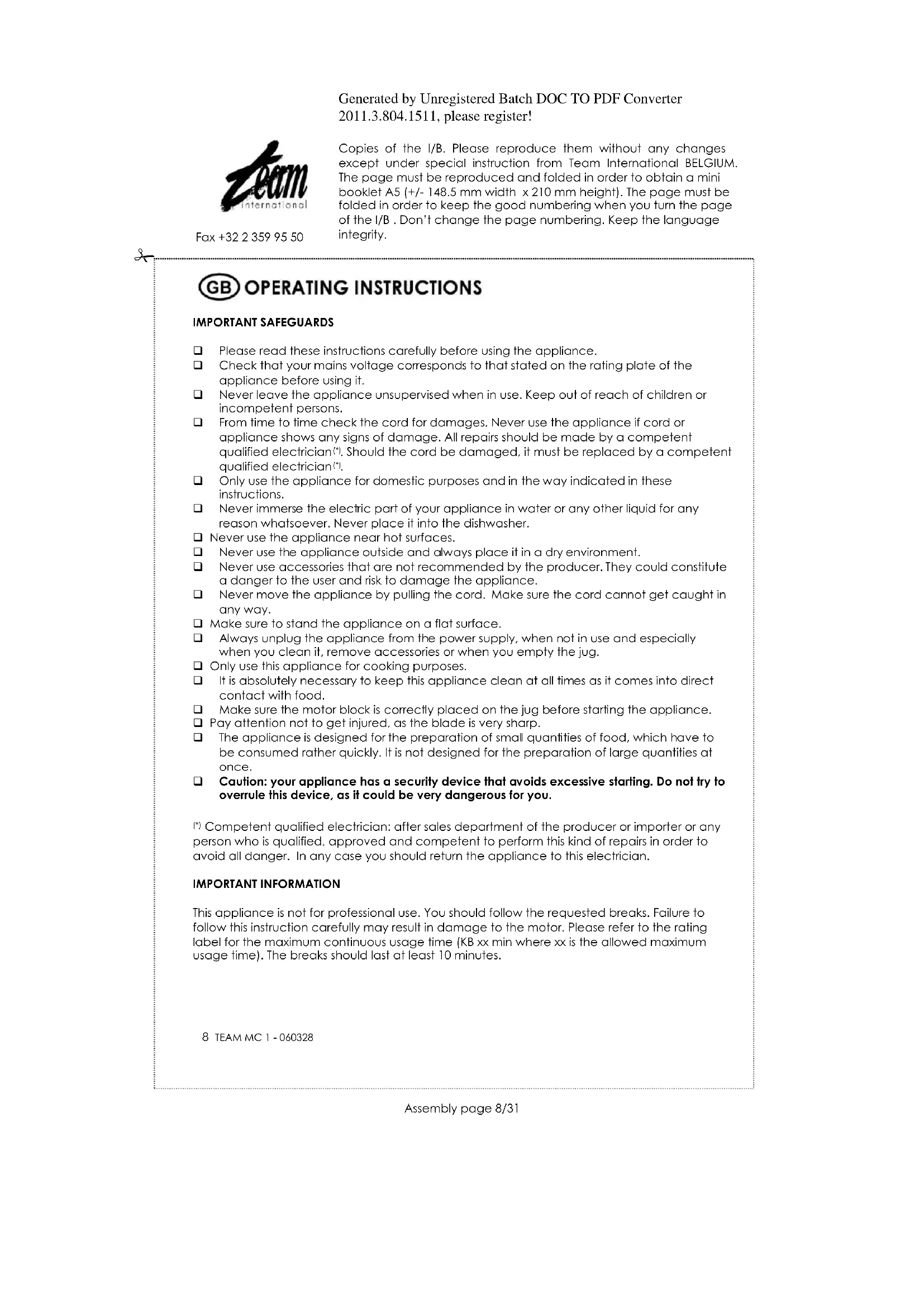 Copies of the I/B. Please reproduce them without any changes except under special instruction from Team International BELGIUM. The page must be reproduced and folded in order to obtain a mini booklet A5 (+/- 148.5 mm width x 210 mm height). The page must be folded in order to keep the good numbering when you turn the page of the I/B. Don't change the page numbering. Keep the language integrity.