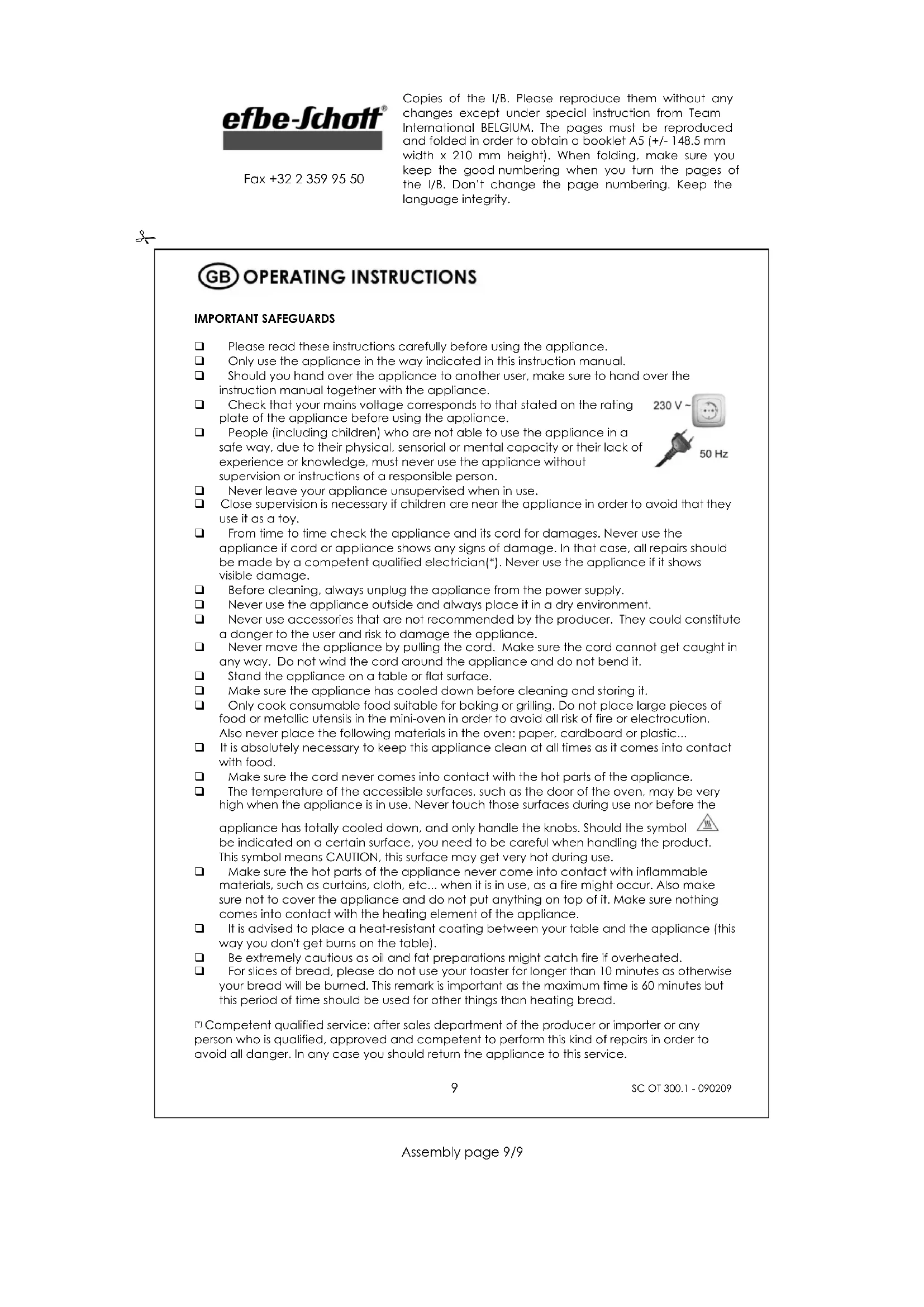 Copies of the I/B. Please reproduce them without any changes except under special instruction from Team International BELGIUM. The pages must be reproduced and folded in order to obtain a booklet A5 (+/- 148.5 mm width x 210 mm height). When folding, make sure you keep the good numbering when you turn the pages of the I/B. Don't change the page numbering. Keep the language integrity.