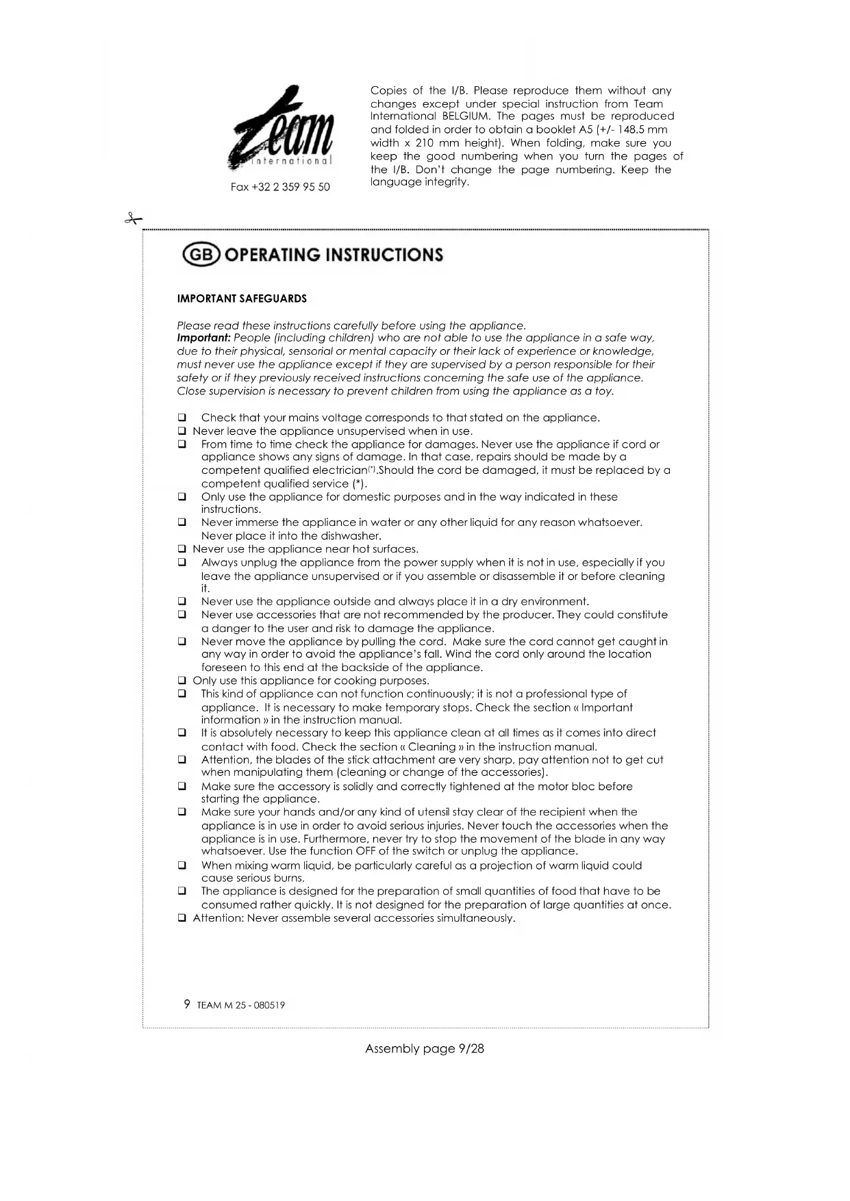 .Should the cord be damaged, it must be replaced by a competent qualified service (*). Only use the appliance for domestic purposes and in the way indicated in these instructions. Never immerse the appliance in water or any other liquid for any reason whatsoever. Never place it into the dishwasher. Never use the appliance near hot surfaces. Always unplug the appliance from the power supply when it is not in use, especially if you leave the appliance unsupervised or if you assemble or disassemble it or before cleaning it. Never use the appliance outside and always place it in a dry environment. Never use accessories that are not recommended by the producer. They could constitute a danger to the user and risk to damage the appliance. Never move the appliance by pulling the cord. Make sure the cord cannot get caught in any way in order to avoid the appliance’s fall. Wind the cord only around the location foreseen to this end at the backside of the appliance. Only use this appliance for cooking purposes. This kind of appliance can not function continuously; it is not a professional type of appliance. It is necessary to make temporary stops. Check the section « Important information » in the instruction manual. It is absolutely necessary to keep this appliance clean at all times as it comes into direct contact with food. Check the section « Cleaning » in the instruction manual. Attention, the blades of the stick attachment are very sharp, pay attention not to get cut when manipulating them (cleaning or change of the accessories). Make sure the accessory is solidly and correctly tightened at the motor bloc before starting the appliance. Make sure your hands and/or any kind of utensil stay clear of the recipient when the appliance is in use in order to avoid serious injuries. Never touch the accessories when the appliance is in use. Furthermore, never try to stop the movement of the blade in any way whatsoever. Use the function OFF of the switch or unplug the appliance. When mixing warm liquid, be particularly careful as a projection of warm liquid could cause serious burns. The appliance is designed for the preparation of small quantities of food that have to be consumed rather quickly. It is not designed for the preparation of large quantities at once. Attention: Never assemble several accessories simultaneously. Copies of the I/B. Please reproduce them without any changes except under special instruction from Team International BELGIUM. The pages must be reproduced and folded in order to obtain a booklet A5 (+/- 148.5 mm width x 210 mm height). When folding, make sure you keep the good numbering when you turn the pages of the I/B. Don’t change the page numbering. Keep the language integrity.