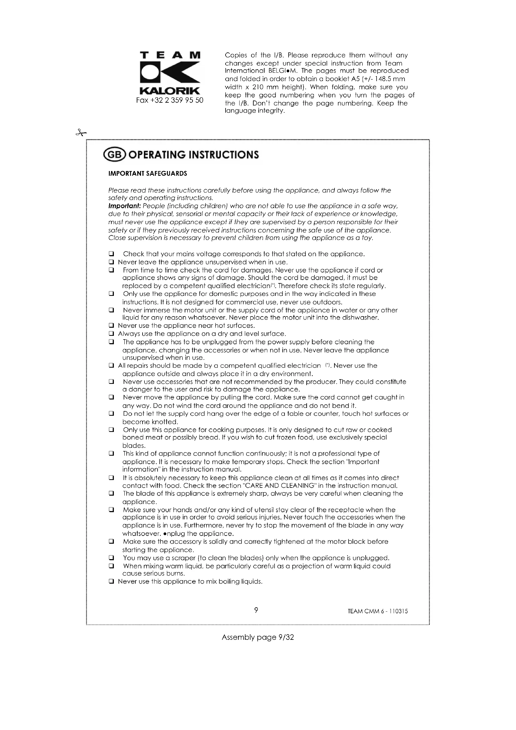 Copies of the I/B. Please reproduce them without any changes except under special instruction from Team International BELGI-M. The pages must be reproduced and folded in order to obtain a booklet A5 (+/- 148.5 mm width x 210 mm height). When folding, make sure you keep the good numbering when you turn the pages of the I/B. Don't change the page numbering. Keep the language integrity.