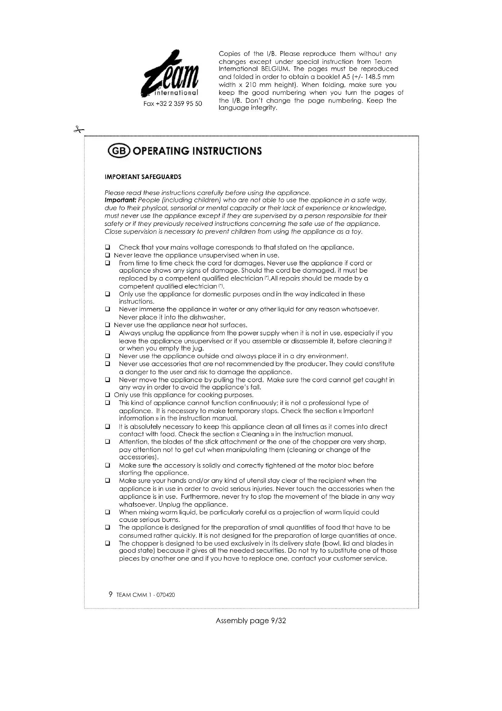 Fax +32 2 359 95 50 Copies of the I/B. Please reproduce them without any changes except under special instruction from Team International BELGIUM. The pages must be reproduced and folded in order to obtain a booklet A5 (+/- 148.5 mm width x 210 mm height). When folding, make sure you keep the good numbering when you turn the pages of the I/B. Don’t change the page numbering. Keep the language integrity.