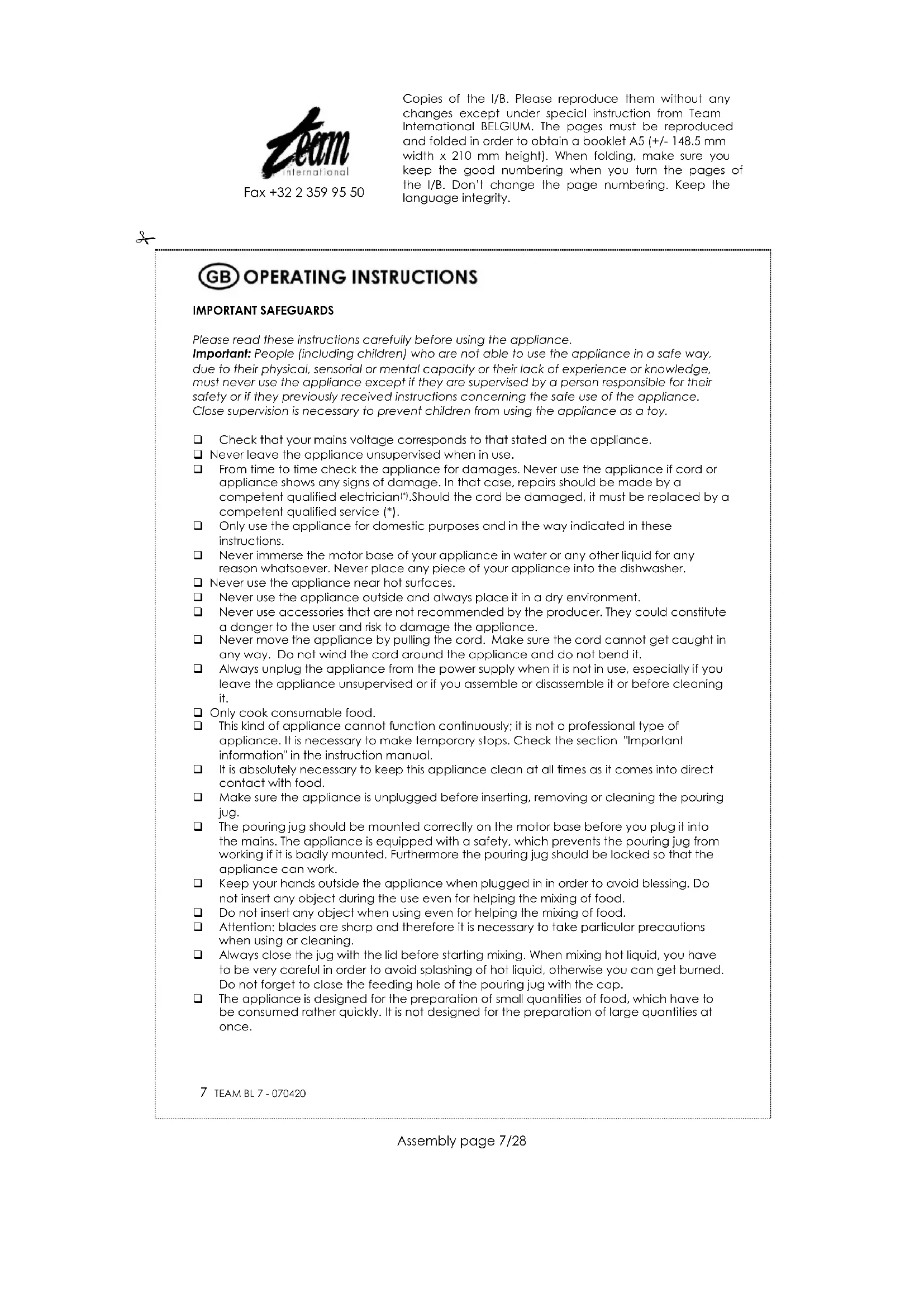 .Should the cord be damaged, it must be replaced by a competent qualified service (*). Only use the appliance for domestic purposes and in the way indicated in these instructions. Never immerse the motor base of your appliance in water or any other liquid for any reason whatsoever. Never place any piece of your appliance into the dishwasher. Never use the appliance near hot surfaces. Never use the appliance outside and always place it in a dry environment. Never use accessories that are not recommended by the producer. They could constitute a danger to the user and risk to damage the appliance. Never move the appliance by pulling the cord. Make sure the cord cannot get caught in any way. Do not wind the cord around the appliance and do not bend it. Always unplug the appliance from the power supply when it is not in use, especially if you leave the appliance unsupervised or if you assemble or disassemble it or before cleaning it. Only cook consumable food. This kind of appliance cannot function continuously; it is not a professional type of appliance. It is necessary to make temporary stops. Check the section "Important information" in the instruction manual. It is absolutely necessary to keep this appliance clean at all times as it comes into direct contact with food. Make sure the appliance is unplugged before inserting, removing or cleaning the pouring jug. The pouring jug should be mounted correctly on the motor base before you plug it into the mains. The appliance is equipped with a safety, which prevents the pouring jug from working if it is badly mounted. Furthermore the pouring jug should be locked so that the appliance can work. Keep your hands outside the appliance when plugged in in order to avoid blessing. Do not insert any object during the use even for helping the mixing of food. Do not insert any object when using even for helping the mixing of food. Attention: blades are sharp and therefore it is necessary to take particular precautions when using or cleaning. Always close the jug with the lid before starting mixing. When mixing hot liquid, you have to be very careful in order to avoid splashing of hot liquid, otherwise you can get burned. Do not forget to close the feeding hole of the pouring jug with the cap. The appliance is designed for the preparation of small quantities of food, which have to be consumed rather quickly. It is not designed for the preparation of large quantities at once. Copies of the I/B. Please reproduce them without any changes except under special instruction from Team International BELGIUM. The pages must be reproduced and folded in order to obtain a booklet A5 (+/- 148.5 mm width x 210 mm height). When folding, make sure you keep the good numbering when you turn the pages of the I/B. Don’t change the page numbering. Keep the language integrity.