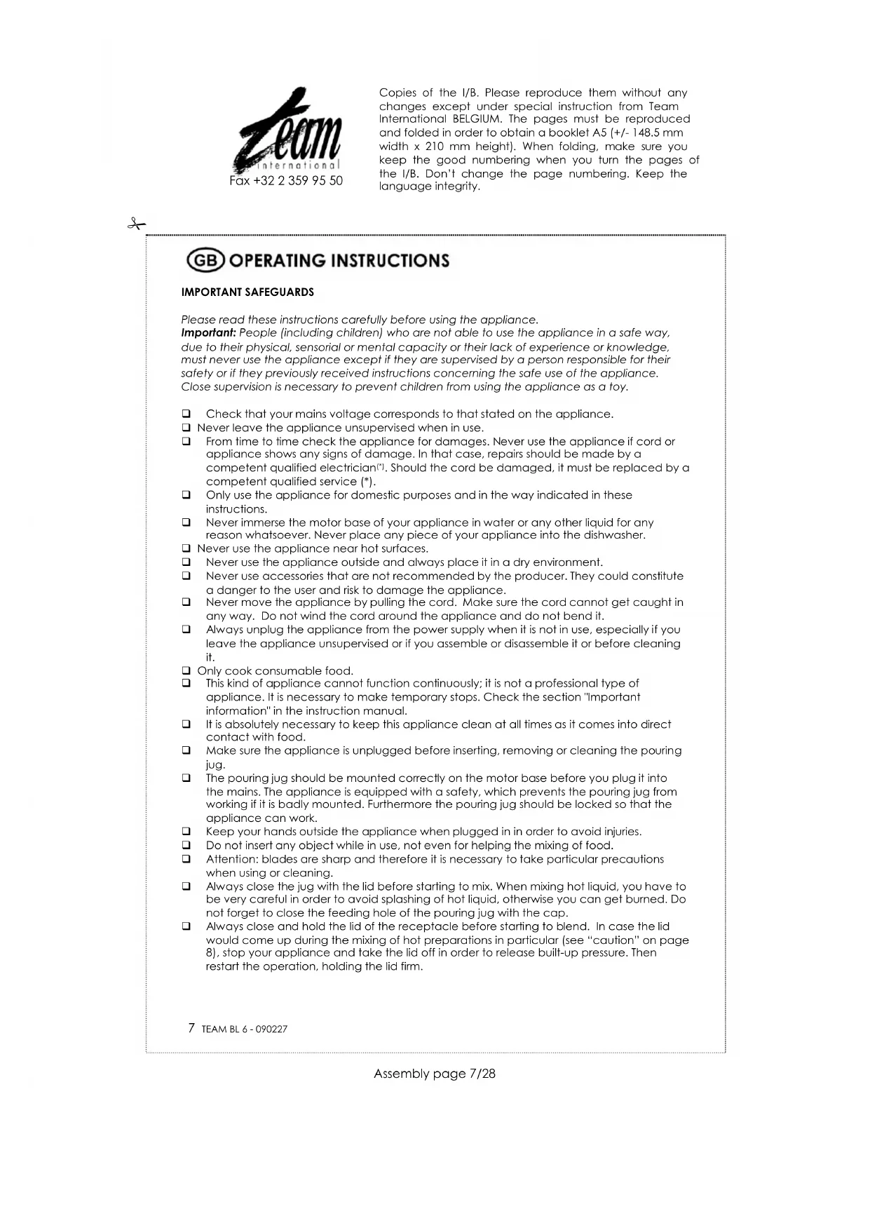 . Should the cord be damaged, it must be replaced by a competent qualified service (*). Only use the appliance for domestic purposes and in the way indicated in these instructions. Never immerse the motor base of your appliance in water or any other liquid for any reason whatsoever. Never place any piece of your appliance into the dishwasher. Never use the appliance near hot surfaces. Never use the appliance outside and always place it in a dry environment. Never use accessories that are not recommended by the producer. They could constitute a danger to the user and risk to damage the appliance. Never move the appliance by pulling the cord. Make sure the cord cannot get caught in any way. Do not wind the cord around the appliance and do not bend it. Always unplug the appliance from the power supply when it is not in use, especially if you leave the appliance unsupervised or if you assemble or disassemble it or before cleaning it. Only cook consumable food. This kind of appliance cannot function continuously; it is not a professional type of appliance. It is necessary to make temporary stops. Check the section "Important information" in the instruction manual. It is absolutely necessary to keep this appliance clean at all times as it comes into direct contact with food. Make sure the appliance is unplugged before inserting, removing or cleaning the pouring jug. The pouring jug should be mounted correctly on the motor base before you plug it into the mains. The appliance is equipped with a safety, which prevents the pouring jug from working if it is badly mounted. Furthermore the pouring jug should be locked so that the appliance can work. Keep your hands outside the appliance when plugged in in order to avoid injuries. Do not insert any object while in use, not even for helping the mixing of food. Attention: blades are sharp and therefore it is necessary to take particular precautions when using or cleaning. Always close the jug with the lid before starting to mix. When mixing hot liquid, you have to be very careful in order to avoid splashing of hot liquid, otherwise you can get burned. Do not forget to close the feeding hole of the pouring jug with the cap. Always close and hold the lid of the receptacle before starting to blend. In case the lid would come up during the mixing of hot preparations in particular (see “caution” on page 8), stop your appliance and take the lid off in order to release built-up pressure. Then restart the operation, holding the lid firm. Copies of the I/B. Please reproduce them without any changes except under special instruction from Team International BELGIUM. The pages must be reproduced and folded in order to obtain a booklet A5 (+/- 148.5 mm width x 210 mm height). When folding, make sure you keep the good numbering when you turn the pages of the I/B. Don’t change the page numbering. Keep the language integrity.