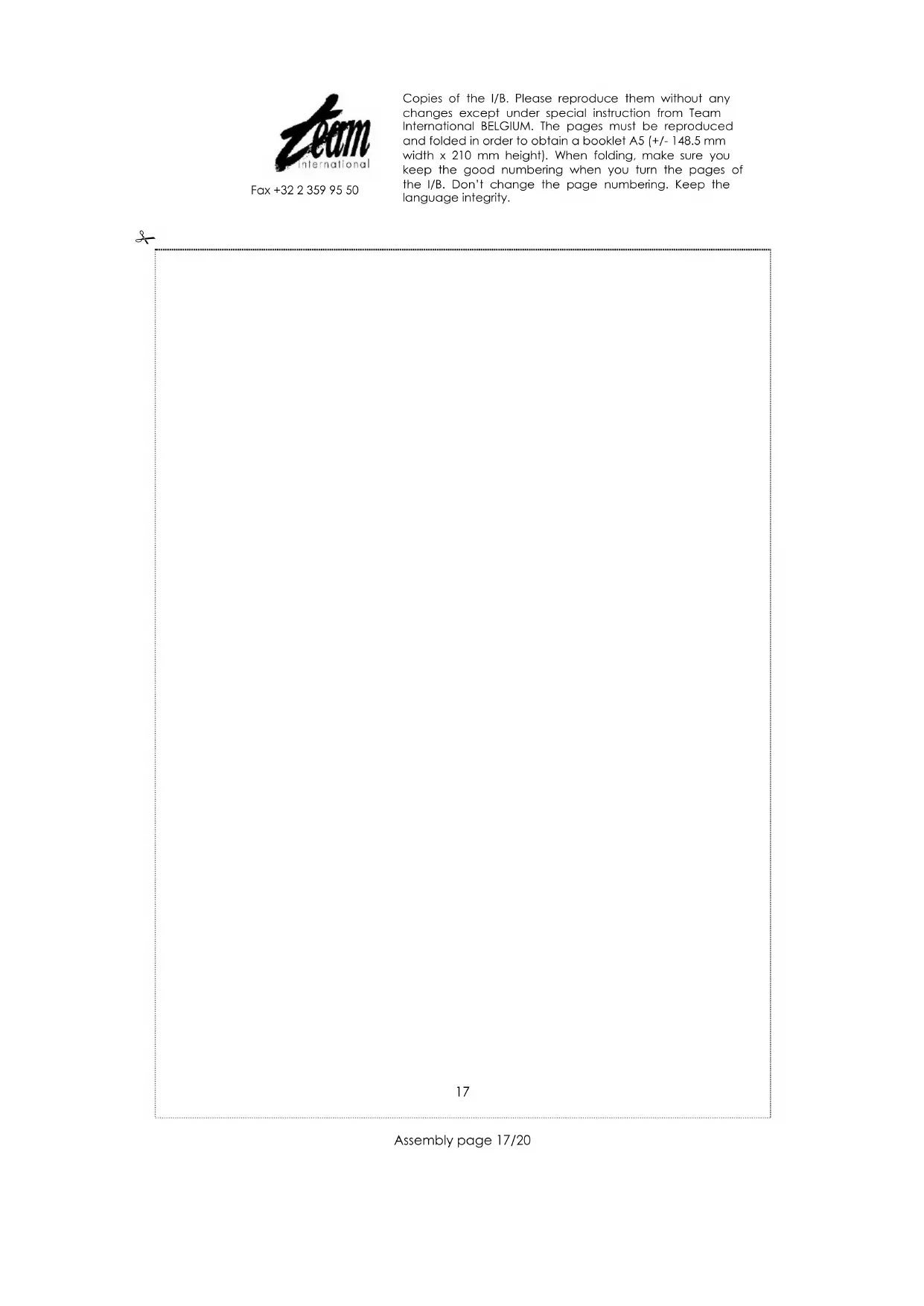 Copies of the I/B. Please reproduce them without any changes except under special instruction from Team International BELGIUM. The pages must be reproduced and folded in order to obtain a booklet A5 (+/- 148.5 mm width x 210 mm height). When folding, make sure you keep the good numbering when you turn the pages of the I/B. Don't change the page numbering. Keep the language integrity.