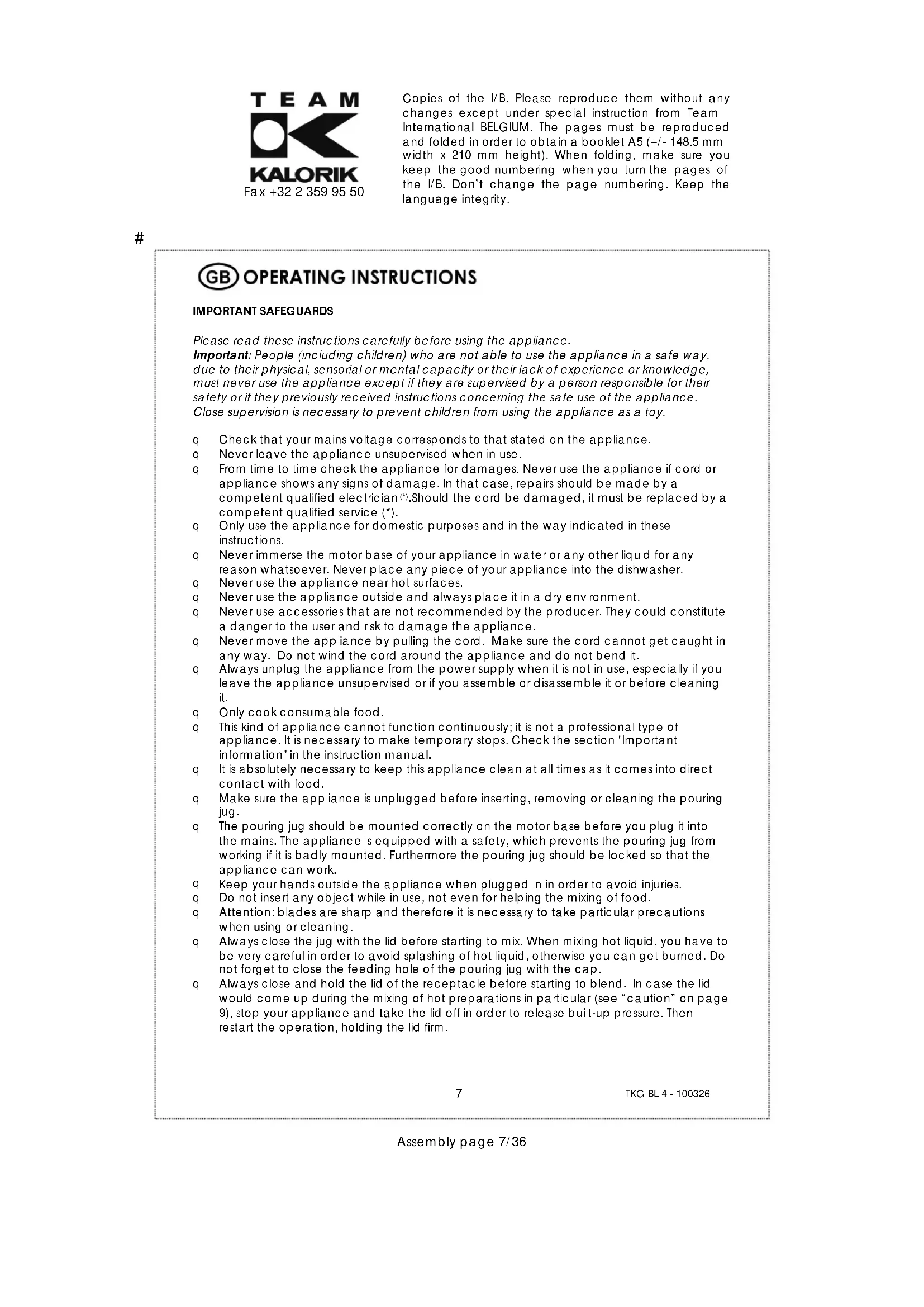 Copies of the I/B. Please reproduce them without any changes except under special instruction from Team International BELGIUM. The pages must be reproduced and folded in order to obtain a booklet A5 (+/- 148.5 mm width x 210 mm height). When folding, make sure you keep the good numbering when you turn the pages of the I/B. Don’t change the page numbering. Keep the language integrity. Front cover page (first page)Assembly page 1/36 Fax +32 2 359 95 50 Standmixer Blender Blender Blender Batidora de Vaso Copo liquidificador Frullatore Blender Blender TKG BL 4 230V~ 50Hz 700W I/B Version 100326# Copies of the I/B. Please reproduce them without any changes except under special instruction from Team International BELGIUM. The pages must be reproduced and folded in order to obtain a booklet A5 (+/- 148.5 mm width x 210 mm height). When folding, make sure you keep the good numbering when you turn the pages of the I/B. Don’t change the page numbering. Keep the language integrity.