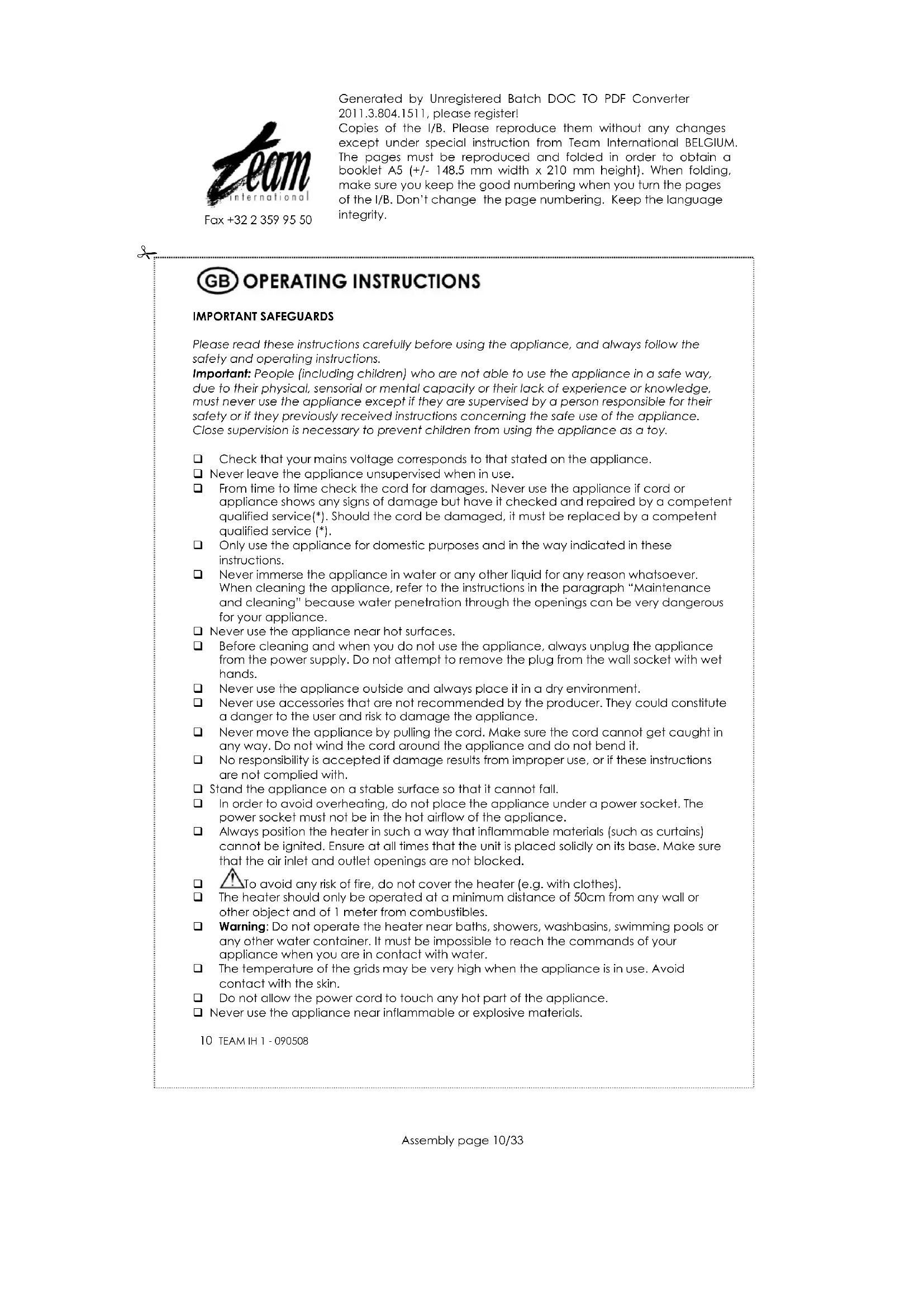 any other water container. It must be impossible to reach the commands of your appliance when you are in contact with water. The temperature of the grids may be very high when the appliance is in use. Avoid contact with the skin. Do not allow the power cord to touch any hot part of the appliance. Never use the appliance near inflammable or explosive materials.Generated by Unregistered Batch DOC TO PDF Converter 2011.3.804.1511, please register! Copies of the I/B. Please reproduce them without any changes except under special instruction from Team International BELGIUM. The pages must be reproduced and folded in order to obtain a booklet A5 (+/- 148.5 mm width x 210 mm height). When folding, make sure you keep the good numbering when you turn the pages of the I/B. Don’t change the page numbering. Keep the language integrity.