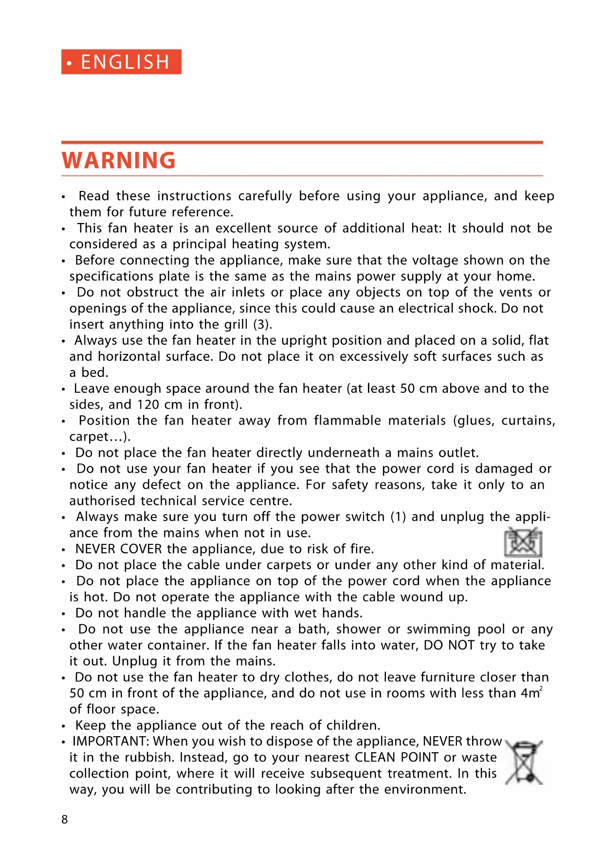 - IMPORTANT: When you wish to dispose of the appliance, NEVER throw it in the rubbish. Instead, go to your nearest CLEAN POINT or waste collection point, where it will receive subsequent treatment. In this way, you will be contributing to looking after the environment.