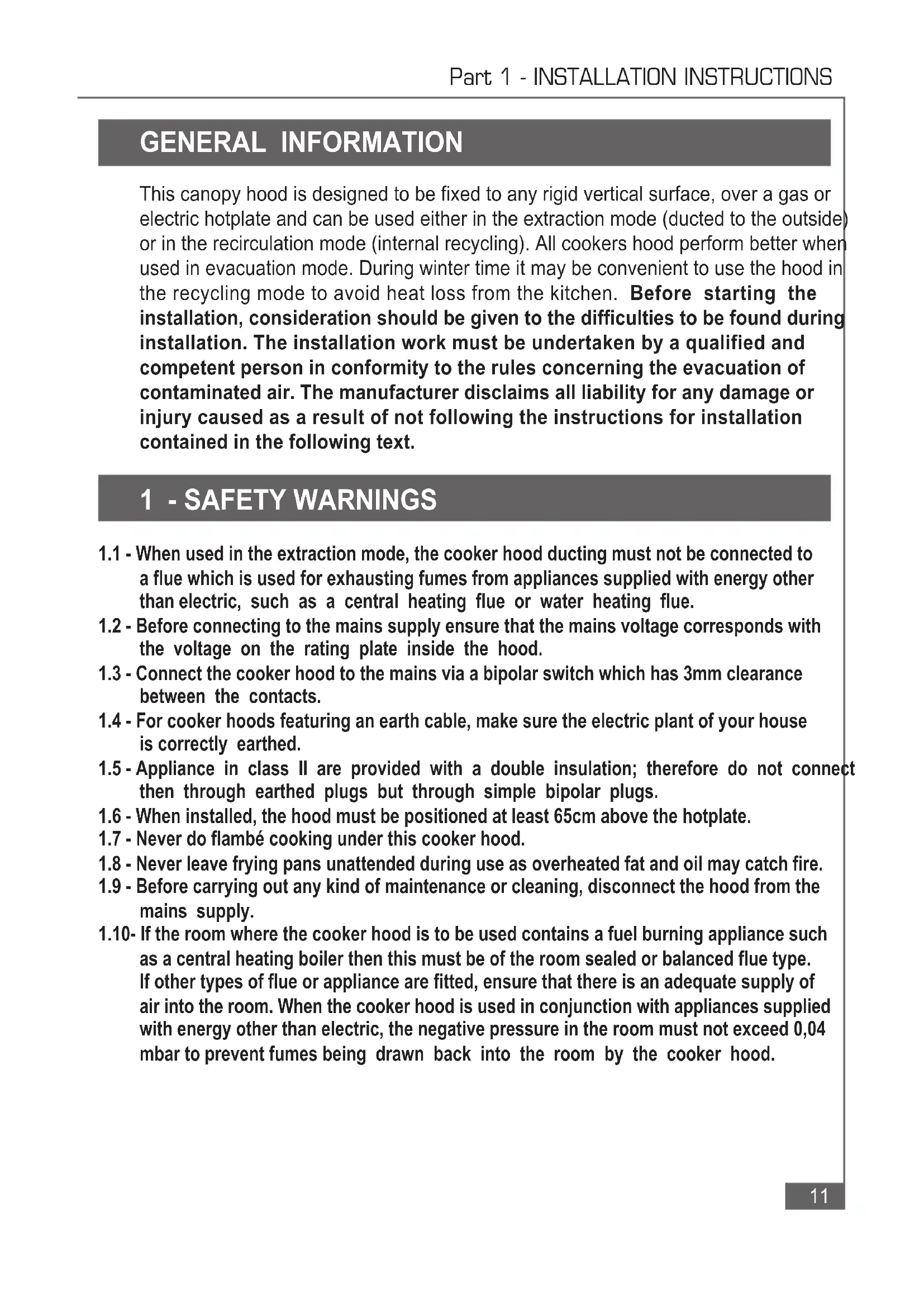 GENERAL INFORMATION This canopy hood is designed to be fixed to any rigid vertical surface, over a gas or electric hotplate and can be used either in the extraction mode (ducted to the outside) or in the recirculation mode (internal recycling). All cookers hood perform better when used in evacuation mode. During winter time it may be convenient to use the hood in the recycling mode to avoid heat loss from the kitchen. Before starting the installation, consideration should be given to the difficulties to be found during installation. The installation work must be undertaken by a qualified and competent person in conformity to the rules concerning the evacuation of contaminated air. The manufacturer disclaims all liability for any damage or injury caused as a result of not following the instructions for installation contained in the following text.