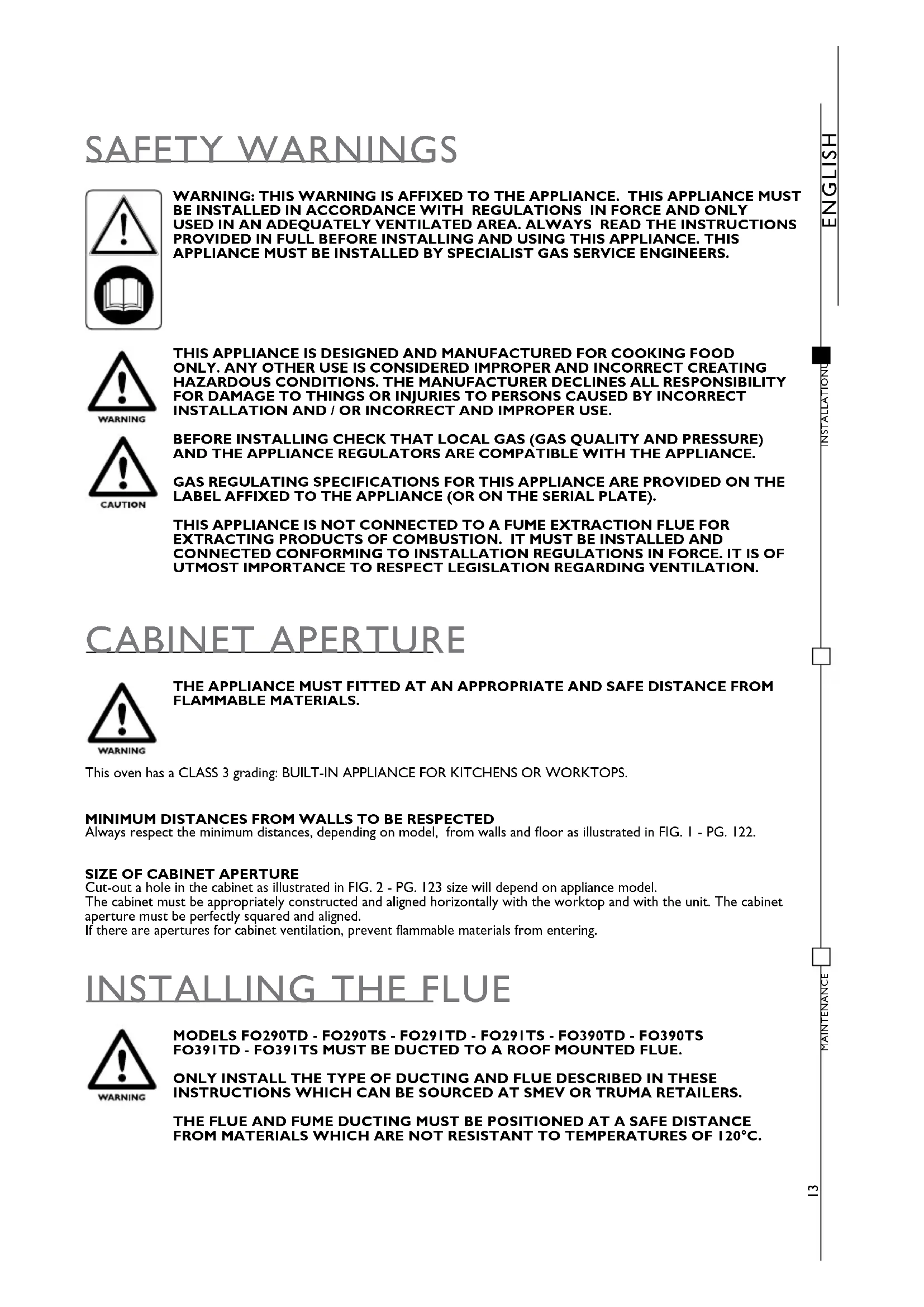 ENGLISH SAFETY WARNINGS THE APPLIANCE MUST FITTED AT AN APPROPRIATE AND SAFE DISTANCE FROM FLAMMABLE MATERIALS. CABINET APERTURE This oven has a CLASS 3 grading: BUILT-IN APPLIANCE FOR KITCHENS OR WORKTOPS.