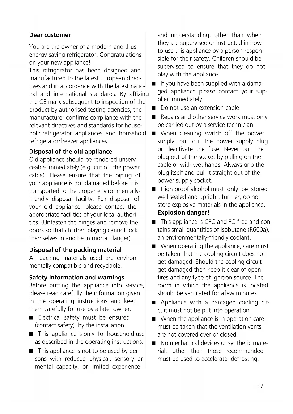 efrost the freezer compartment if the ice formation becomes excessive. A thick coa- ting of ice reduces the effectiveness of the cold transfer to the frozen products. Keep the frozen products as cold as possi- ble and well insulated during the defro- sting time, e.g. pack them in newspaper. – Turn off the appliance by using the main switch (3 sec.) – Leave the doors open. Defrosting can be accelerated si gnificantly if you place a bowl of hot water in the fre- ezer compartment. Attention: do not use sharp implements to remove ice or any- thing hard frozen. Do not use an electrical heater or an open flame for defrosting. – After defrosting clean the interior and dry it thoroughly. – Turn on the appliance by using the main switch (3 sec.) Cleaning The appliance is to be kept clean for the hygienic storage of food stuffs. It should be washed out from time to time with a mild soapy solution and then dried. An occasio- nal wiping with a vinegar solution suppres- ses odours and is recommended. Keeping the door seals clean stops them from sticking and thus avoids them being dama- ged. No scouring cleaners or scratching cloths are to be used. Clean the door seals with a soft brush. If the appliance has not been used for s ome time, turn off by using the main switch (3 sec.). Empty the appliance, defrost it, clean, and then leave the cold room as well as the freezer compartment open. – For cleaning the control element please use only a humid flannel. – Be careful that as little cleaning water as possible goes though the drainage channel into the collection dish. – Before being put back in use, the appli- ance and the seals of t he cold room and the freezer must all be completely dry. Informations for energy-saving use ■ As far as possible, use the cooling unit in its as-delivered state. The arrangement of drawers, shelves and trays ensures the best possible temperature distribution. ■ Do not install the unit near radiators, radiator pipes or smoke extractors and protect it as far as possible from direct sunlight ■ Make sure the unit doors are kept open for as short a time as possible. The quicker the doors are closed again, the less cold is lost.