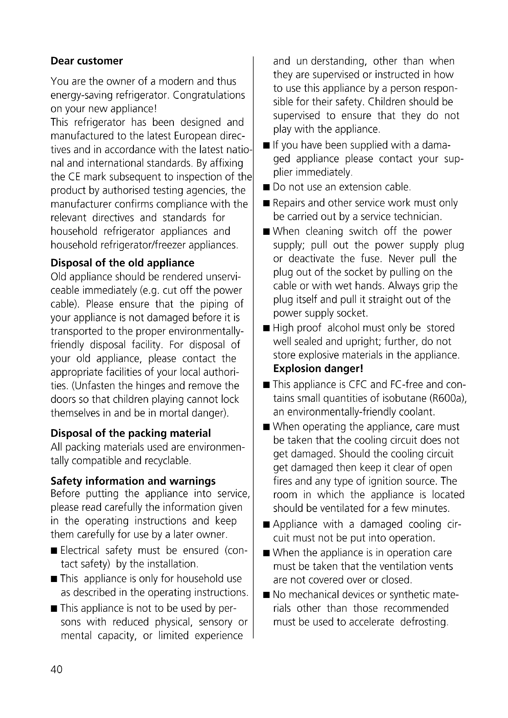 aerazione 10/6-fessura4/6-fessura La protezione contro le scariche elettriche deve essere assicurata dall’installatore. Se la presa di corrente non è più accessibile dopo l’incastro dell’appa recchio, é necessario prevedere un sistema di disins- erzione. Ammessi sono i sistemi di disinserzione con interruttori aventi un’apertura fra i contatti di almeno 3 mm e che interrompono la reta tramite un teleruttore assicurato da dei fusibili.40 Dear customer You are the owner of a modern and thus energy-saving refrigerator. Congratulations on your new appliance! This refrigerator has been designed and manufactured to the latest European direc- tives and in accordance with the latest natio- nal and international standards. By affixing the CE mark subsequent to inspection of the product by authorised testing agencies, the manufacturer confirms compliance with the relevant directives and standards for household refrigerator appliances and household refrigerator/freezer appliances. Disposal of the old appliance Old appliance should be rendered unservi- ceable immediately (e.g. cut off the power cable). Please ensure that the piping of your appliance is not damaged before it is transported to the proper environmentally- friendly disposal facility. For disposal of your old appliance, please contact the appropriate facilities of your local authori- ties. (Unfasten the hinges and remove the doors so that children playing cannot lock themselves in and be in mortal danger). Disposal of the packing material All packing materials used are environmen- tally compatible and recyclable. Safety information and warnings Before putting the appliance into service, please read carefully the information given in the operating instructions and keep them carefully for use by a later owner. ■ Electrical safety must be ensured (con- tact safety) by the installation. ■ This appliance is only for household use as described in the operating instructions. ■ This appliance is not to be used by per- sons with reduced physical, sensory or mental capacity, or limited experience and un derstanding, other than when they are supervised or instructed in how to use this appliance by a person respon- sible for their safety. Children should be supervised to ensure that they do not play with the appliance. ■ If you have been supplied with a dama- ged appliance please contact your sup- plier immediately. ■ Do not use an extension cable. ■ Repairs and other service work must only be carried out by a service technician. ■ When cleaning switch off the power supply; pull out the power supply plug or deactivate the fuse. Never pull the plug out of the socket by pulling on the cable or with wet hands. Always grip the plug itself and pull it straight out of the power supply socket. ■ High proof alcohol must only be stored well sealed and upright; further, do not store explosive materials in the appliance. Explosion danger! ■ This appliance is CFC and FC-free and con- tains small quantities of isobutane (R600a), an environmentally-friendly coolant. ■ When operating the appliance, care must be taken that the cooling circuit does not get damaged. Should the cooling circuit get damaged then keep it clear of open fires and any type of ignition source. The room in which the appliance is located should be ventilated for a few minutes. ■ Appliance with a damaged cooling cir- cuit must not be put into operation. ■ When the appliance is in operation care must be taken that the ventilation vents are not covered over or closed. ■ No mechanical devices or synthetic mate- rials other than those recommended must be used to accelerate defrosting.41 ■ No liability will be accepted for any pos- sible damage if the appliance is used for any other purpose, incorrectly operated, or not repaired by a professional techni- cian. In such cases the guarantee and other liabilities are rendered null and void. ■ If the connection cable of the appliance is damaged it must be replaced by the manufacturer or by his customer service or by a similarly qualified person to avoid any liability. ■ Warning: do not operate any electrically- driven devices inside the foodstuff com- partment. Controls Child safety lock The buttons must be pressed for at least 3 seconds. Alarm acknowledgement Any button can be used to acknowledge the alarm function. 1 Main ON/OFF button 2 Holiday function: The refrigerator is swiched off and the freezer remains in operation. OF is shown on the refrigerator temperature display (5). 3 Increase refrigerator temperature (up to max. 9 °C): After 3 seconds the temperature display starts to flash and shows the selected temperature value. Each time you now press the button, the temperature value is increased by 1 °C. If you hold down the button, the value increases automa- tically until you release the button or the maximum value is reached. Approx. 5 seconds after releasing the button, the display stops flashing and the current average temperature is displayed again.
