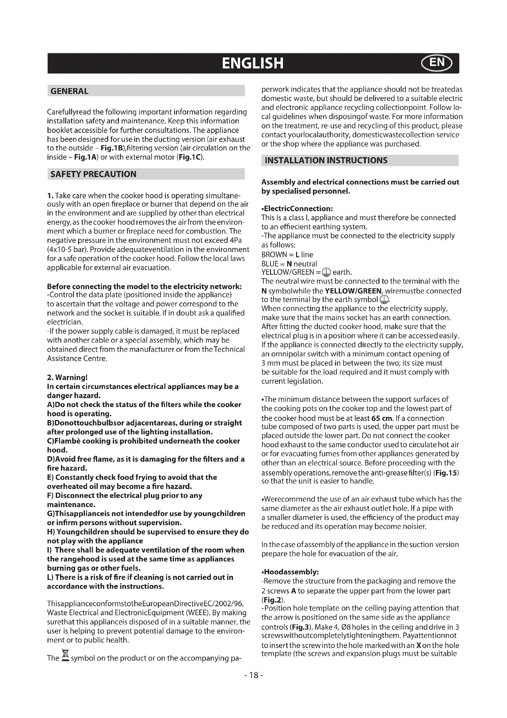 the rangehood is used at the same time as appliances burning gas or other fuels. L) There is a risk of re if cleaning is not carried out in accordance with the instructions. ThisapplianceconformstotheEuropeanDirectiveEC/2002/96, Waste Electrical and ElectronicEquipment (WEEE). By making surethat this applianceis disposed of in a suitable manner, the user is helping to prevent potential damage to the environ- ment or to public health. The symbol on the product or on the accompanying pa- perwork indicates that the appliance should not be treatedas domestic waste, but should be delivered to a suitable electric and electronic appliance recycling collectionpoint. Follow lo- cal guidelines when disposingof waste. For more information on the treatment, re-use and recycling of this product, please contact yourlocalauthority, domesticwastecollection service or the shop where the appliance was purchased. INSTALLATION INSTRUCTIONS Assembly and electrical connections must be carried out by specialised personnel.