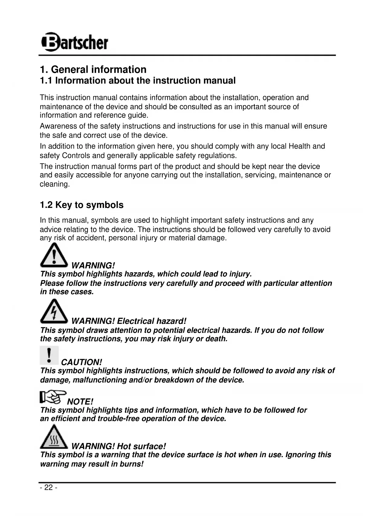 In this manual, symbols are used to highlight important safety instructions and any advice relating to the device. The instructions should be followed very carefully to avoid any risk of accident, personal injury or material damage. WARNING! This symbol highlights hazards, which could lead to injury. Please follow the instructions very carefully and proceed with particular attention in these cases. WARNING! Electrical hazard! This symbol draws attention to potential electrical hazards. If you do not follow the safety instructions, you may risk injury or death. CAUTION! This symbol highlights instructions, which should be followed to avoid any risk of damage, malfunctioning and/or breakdown of the device. NOTE! This symbol highlights tips and information, which have to be followed for an efficient and trouble-free operation of the device. WARNING! Hot surface! This symbol is a warning that the device surface is hot when in use. Ignoring this warning may result in burns!- 23 -