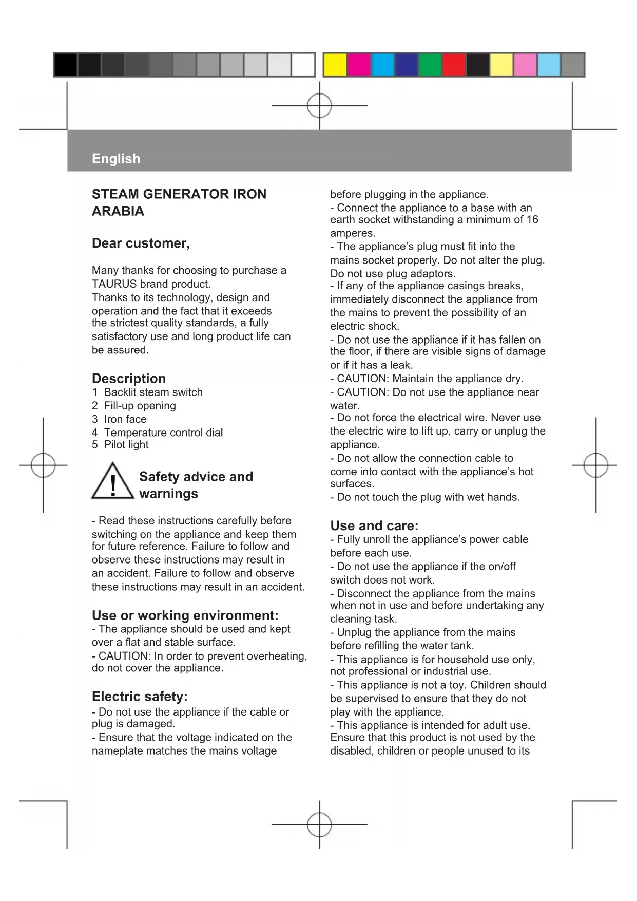 Download the instructions for your Iron in PDF format for free! Find your manual Arabia - TAURUS and take your electronic device back in hand. On this page are published all the documents necessary for the use of your device. Arabia by TAURUS.