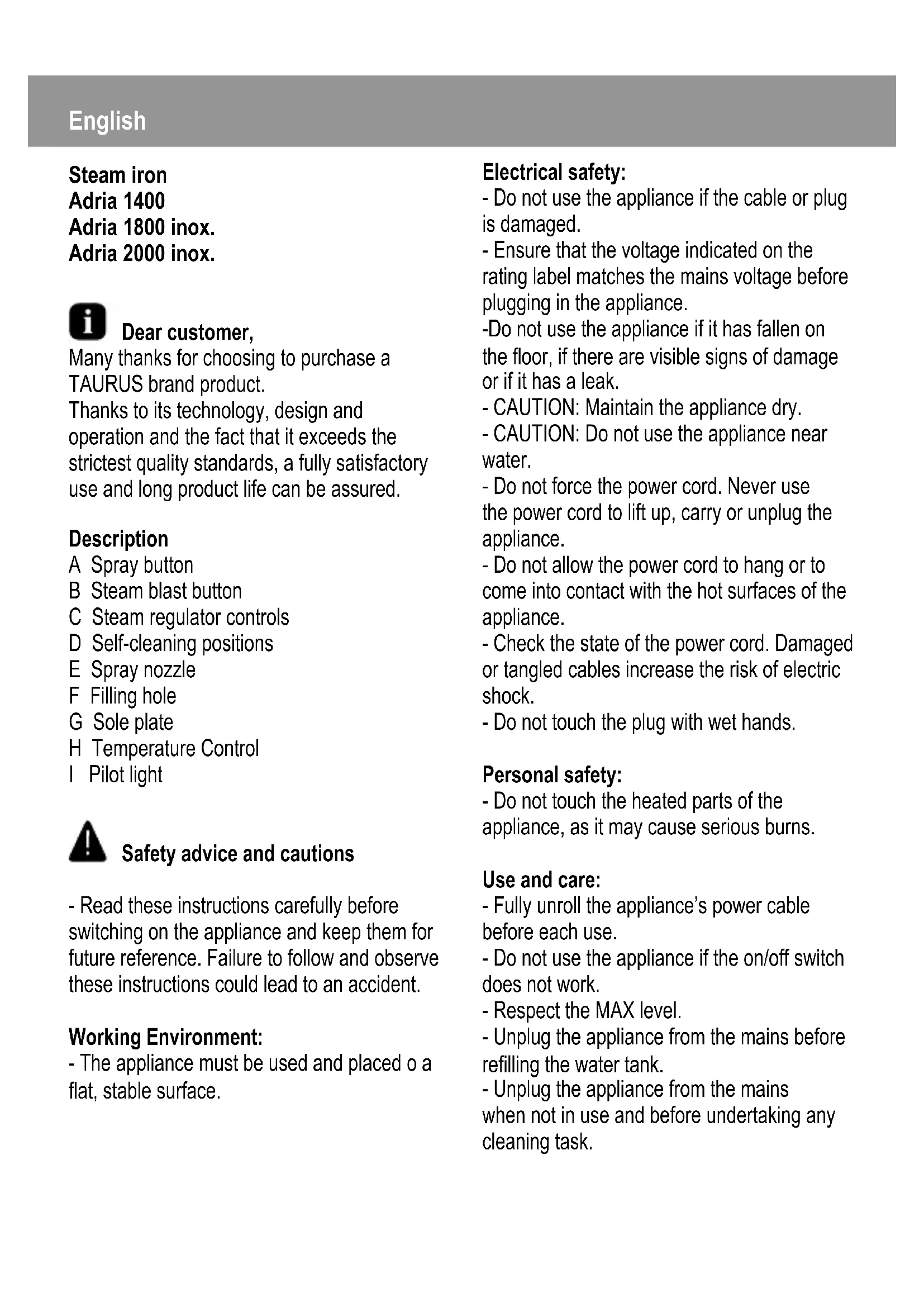 Download the instructions for your Iron in PDF format for free! Find your manual Adria 1400 - TAURUS and take your electronic device back in hand. On this page are published all the documents necessary for the use of your device. Adria 1400 by TAURUS.