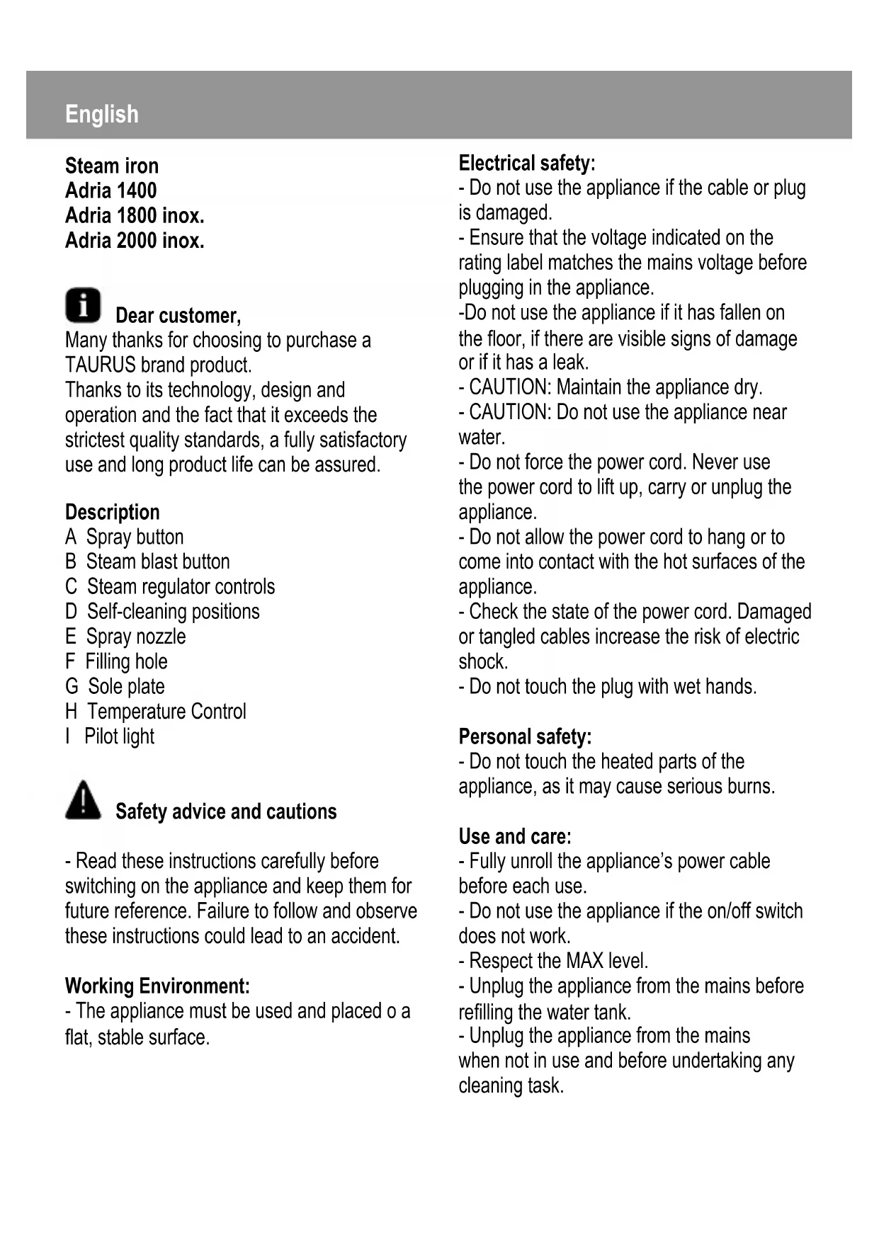 Adria 1800 inox - Iron TAURUS - Free user manual and instructions