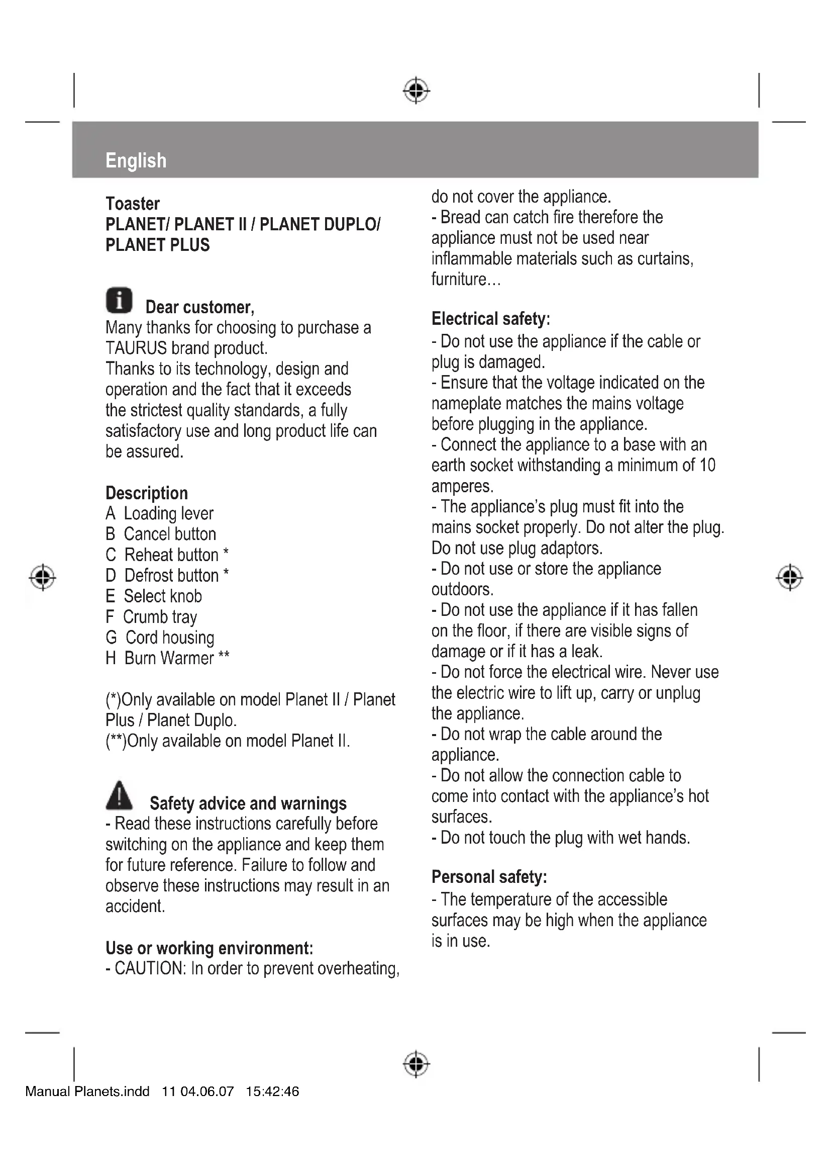 PLANET PLUS Dear customer, Many thanks for choosing to purchase a TAURUS brand product. Thanks to its technology, design and operation and the fact that it exceeds the strictest quality standards, a fully satisfactory use and long product life can be assured. Description A Loading lever B Cancel button C Reheat button * D Defrost button * E Select knob F Crumb tray G Cord housing H Burn Warmer ** (*)Only available on model Planet II / Planet Plus / Planet Duplo. (**)Only available on model Planet II. Safety advice and warnings - Read these instructions carefully before switching on the appliance and keep them for future reference. Failure to follow and observe these instructions may result in an accident. Use or working environment: - CAUTION: In order to prevent overheating, do not cover the appliance. - Bread can catch fire therefore the appliance must not be used near inflammable materials such as curtains, furniture… Electrical safety: - Do not use the appliance if the cable or plug is damaged. - Ensure that the voltage indicated on the nameplate matches the mains voltage before plugging in the appliance. - Connect the appliance to a base with an earth socket withstanding a minimum of 10 amperes. - The appliance’s plug must fit into the mains socket properly. Do not alter the plug. Do not use plug adaptors. - Do not use or store the appliance outdoors. - Do not use the appliance if it has fallen on the floor, if there are visible signs of damage or if it has a leak. - Do not force the electrical wire. Never use the electric wire to lift up, carry or unplug the appliance. - Do not wrap the cable around the appliance. - Do not allow the connection cable to come into contact with the appliance’s hot surfaces. - Do not touch the plug with wet hands. Personal safety: - The temperature of the accessible surfaces may be high when the appliance is in use. Manual Planets.indd 11 04.06.07 15:42:46Use and care: - Fully unroll the appliance’s power cable before each use. - Do not use the appliance if the on/off switch does not work. - Do not move the appliance while in use. - Do not turn the appliance over while it is in use or connected to the mains. - Disconnect the appliance from the mains when not in use and before undertaking any cleaning task. - This appliance is for household use only, not professional or industrial use. - This appliance is intended for adult use. Ensure that this product is not used by the disabled, children or people unused to its handling. - This appliance should be stored out of reach of children and/or the disabled. - Do not put the appliance away if it is still hot. - Any misuse or failure to follow the instructions for use renders the guarantee and the manufacturer’s liability null and void. Instructions for use Before use: - Before using this product for the first time, it is advisable to test it without bread. Use: - Connect the appliance to the mains. - Put the slice/slices of bread into the appliance. - Use the select knob to reach the desired toasting level. - Start the appliance by sliding the loading lever down until a “click” is heard. - The slice/slices will be automatically centred for a uniform toasting. - After the selected toasting time the appliance will switch off automatically. - The appliance has an extra lift function which allows a more comfortable extraction of the toast. To do this, move the loading lever upwards. Cancel function: - The cancel function allows the interruption of the use of the appliance. To do this, press the corresponding function button (B). Reheat function: - The reheat function is for reheating previously toasted bread. To do this, press the corresponding function button (C), place the toast and move the loading lever down. Defrost function: - The defrost function is for defrosting slices of bread. To do this, press the corresponding function button (D), place the frozen slice of bread and move the loading lever down. Once you have finished using the appliance: - Unplug the appliance from the mains. - Put the cable back in the cable housing. Manual Planets.indd 12 04.06.07 15:42:46Cleaning - Unplug the appliance from the mains and let it cool before starting any cleaning. - Clean the equipment with a damp cloth with a few drops of washing-up liquid and then dry. - Do not use solvents, or products with an acid or base pH such as bleach, or abrasive products, for cleaning the appliance. - Do not submerge the appliance in water or any other liquid, or place it under a running tap. - It is advisable to clean the appliance regularly and remove any food remains. Crumb tray: - This appliance has a tray which allows the crumbs to be caught inside the appliance. - Remove the appliance’s tray. - Pour away the contents of the tray. - Gently shake the appliance to eliminate any other breadcrumbs still inside the appliance. - Replace the tray in the appliance. Anomalies and repair - Take the appliance to an authorised technical support service if problems arise. Do not try to dismantle or repair without assistance, as this may be dangerous. - If the connection to the mains has been damaged, it must be replaced and you should proceed as you would in the case of damage. Ecology and recyclability of the product - The materials of which the packaging of this appliance consists are included in a collection, classification and recycling system. Should you wish to dispose of them, use the appropriate public containers for each type of material. - The product does not contain concentrations of substances that could be considered harmful to the environment. - Should you wish to dispose of the product once its working life has ended, take it to an authorised waste agent for the selective collection of waste from electric and electronic appliances. This appliance complies with Directive 73/23/EC on Low Voltage and Directive 89/336/EC on Electromagnetic Compatibility. Manual Planets.indd 13 04.06.07 15:42:46Environnement d’utilisa