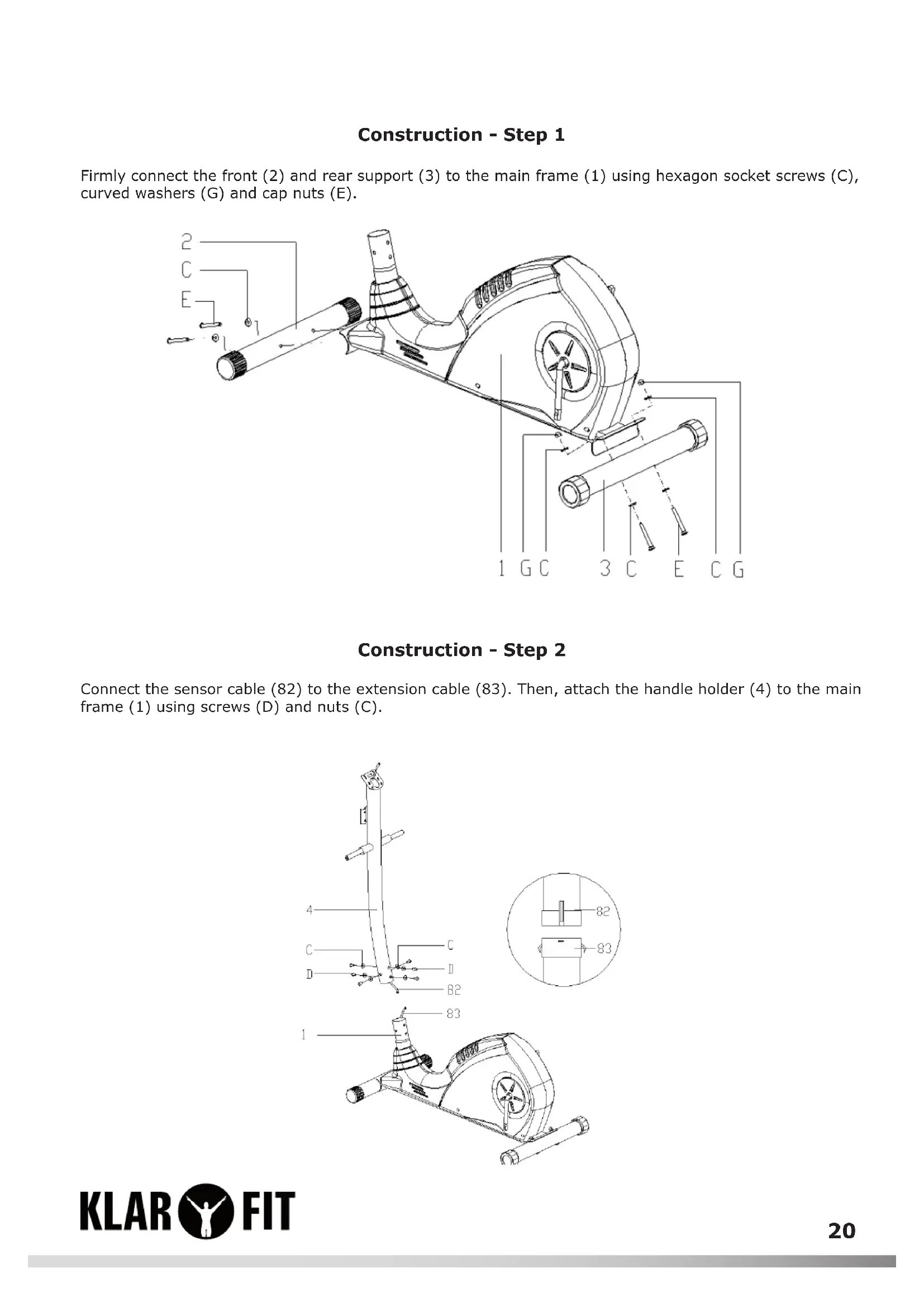 Firmly connect the front (2) and rear support (3) to the main frame (1) using hexagon socket screws (C), curved washers (G) and cap nuts (E).