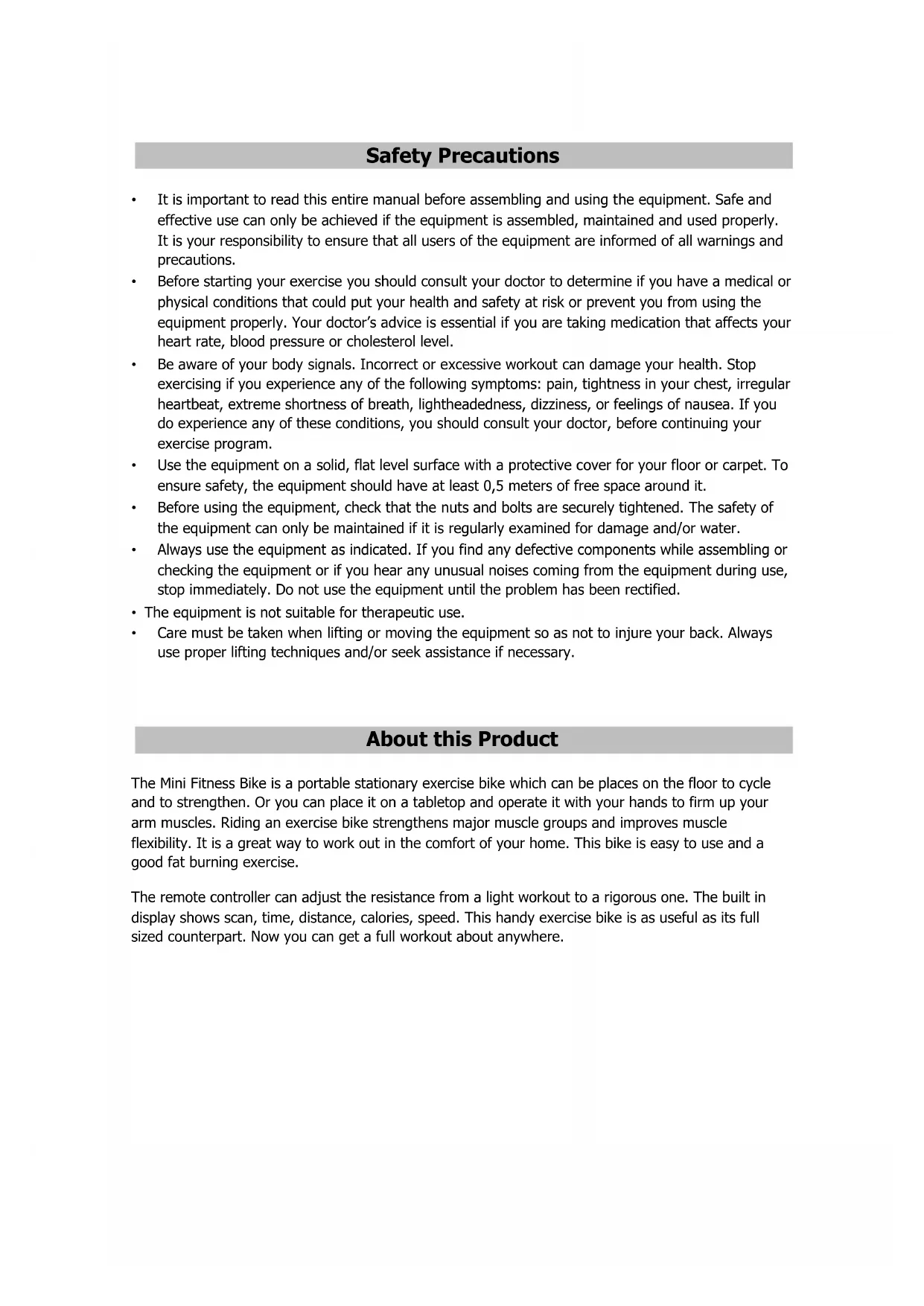 - It is important to read this entire manual before assembling and using the equipment. Safe and effective use can only be achieved if the equipment is assembled, maintained and used properly. It is your responsibility to ensure that all users of the equipment are informed of all warnings and precautions.