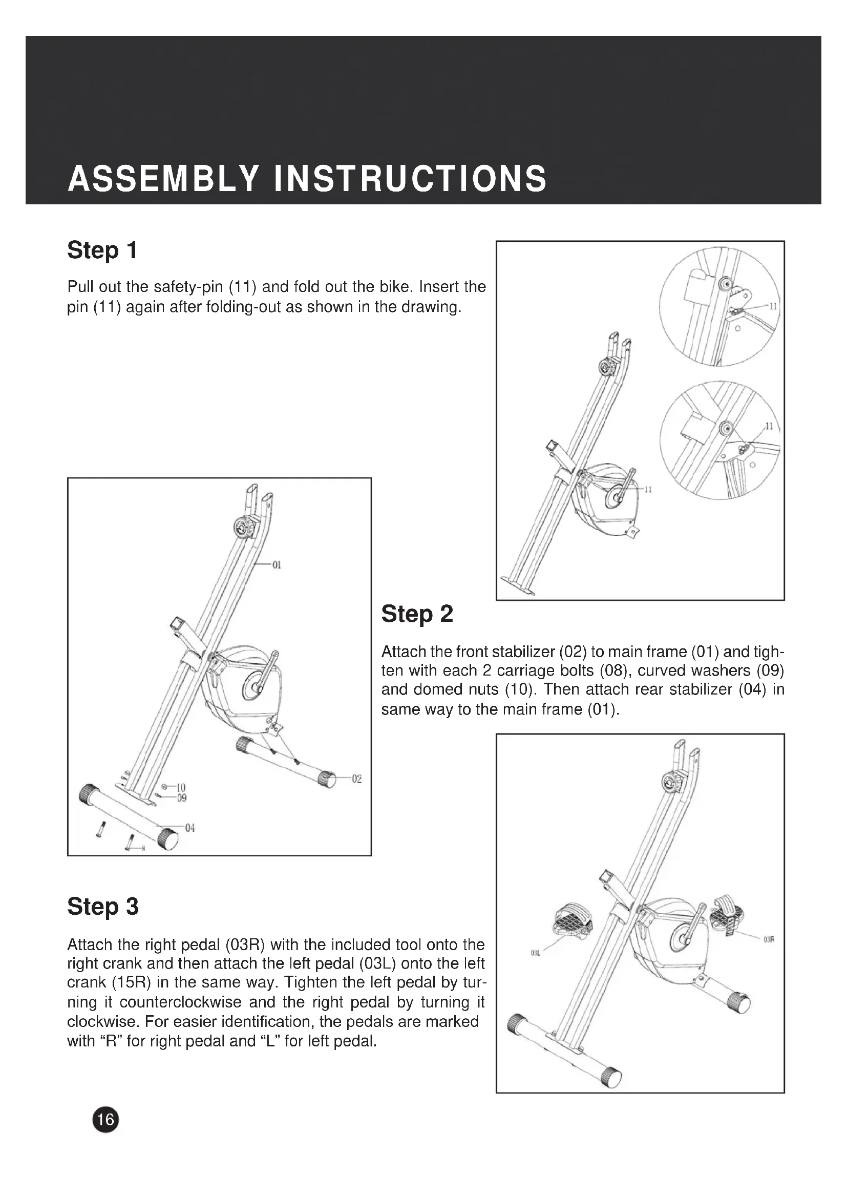 Attach the right pedal (03R) with the included tool onto the right crank and then attach the left pedal (03L) onto the left crank (15R) in the same way. Tighten the left pedal by turning it counterclockwise and the right pedal by turning it clockwise. For easier identification, the pedals are marked with "R" for right pedal and "L" for left pedal.