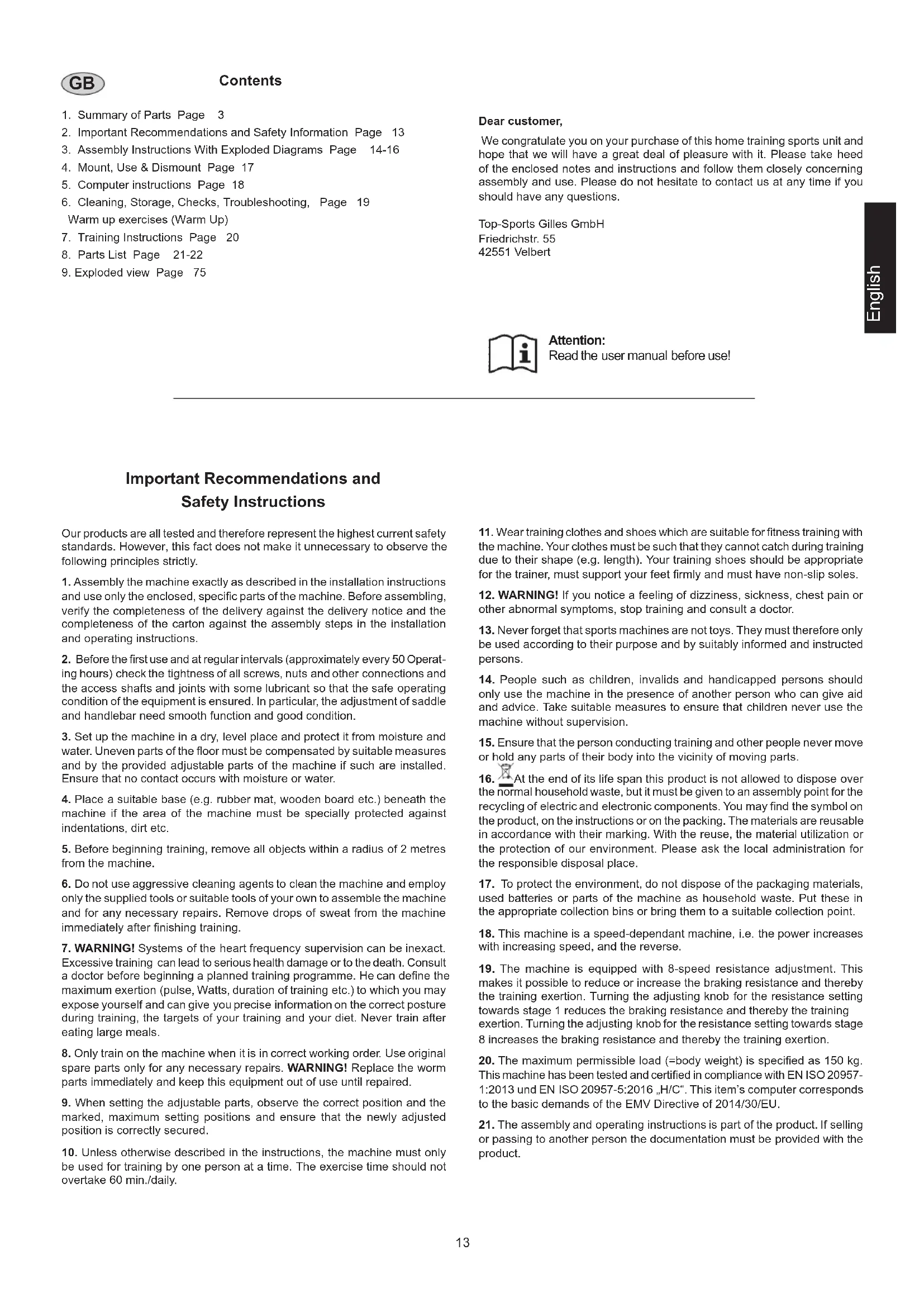 or passing to another person the documentation must be provided with the product.Dear customer, We congratulate you on your purchase of this home training sports unit and hope that we will have a great deal of pleasure with it. Please take heed of the enclosed notes and instructions and follow them closely concerning assembly and use. Please do not hesitate to contact us at any time if you should have any questions. Top-Sports Gilles GmbHFriedrichstr. 55 42551 Velbert English Attention: Read the user manual before use!14 Assembly Instructions Remove all the separate parts from the packaging, lay them on the oor and check roughly that all are there on the base of the assembly steps. Please note that a number of parts have been connected directly to the main frame and preassembled. In addition, there are several other individual parts that have been attached to separate units. This will make it easier and quicker for you to assemble the equipment. Assembly time: 30 - 40 min. Step 1: Attach the stabilizer (20+27) at main frame (1).