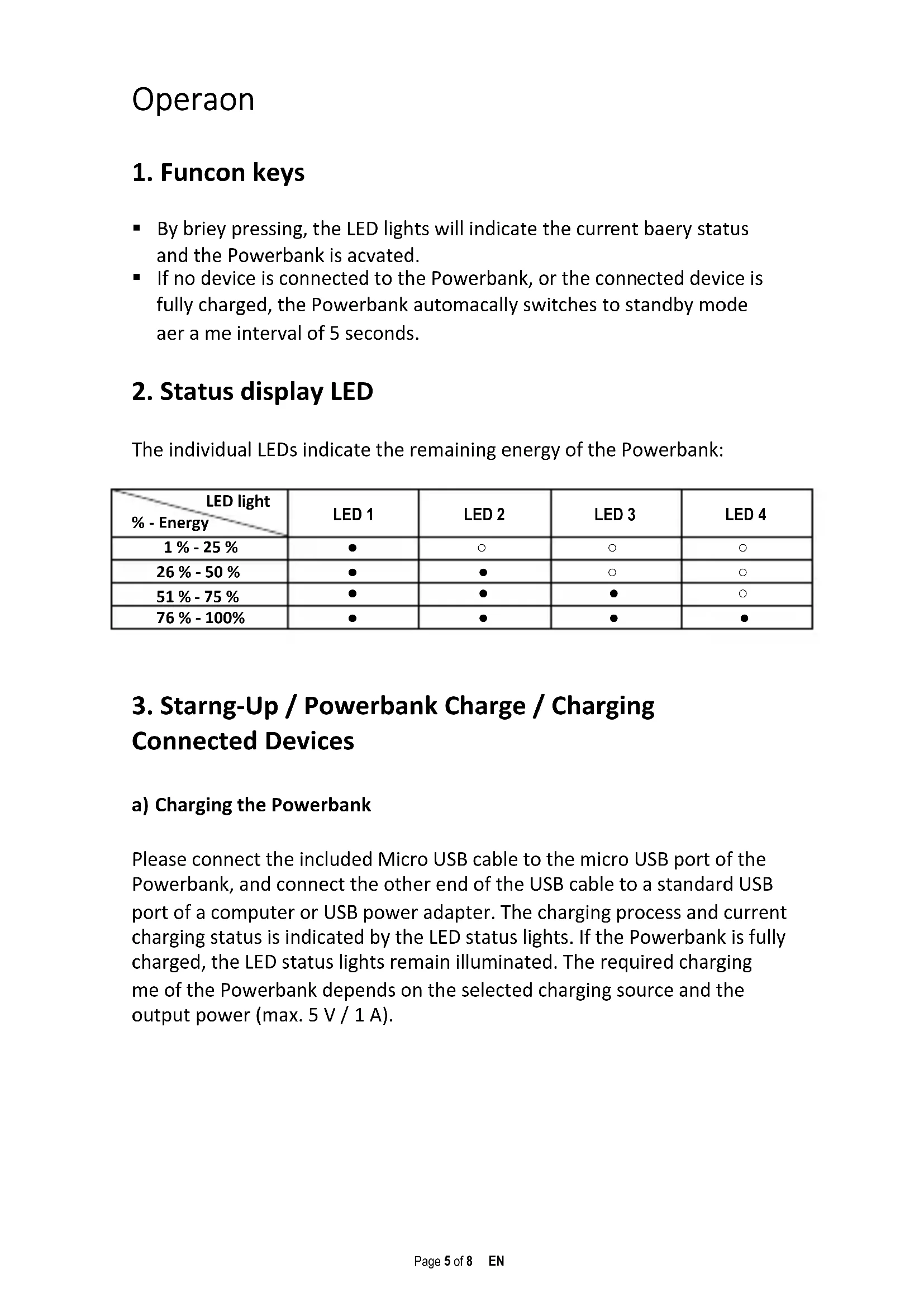 POWERBANK A2600Page 2 of 8 EN About this manual Read this manual carefully and observe, read and follow all instructions mentioned in this to ensure the long life and reliable use of the device. Please keep this manual handy for future reference and pass it on to other users of the device. Intended use This Powerbank is meant solely for the purpose of power supply to devices with an operating voltage of 5V DC (mobile phones, MP3 player etc.). Any other use is considered as unintended use and may lead to damages and injuries. Claims of any type resulting from unintended use are ruled out. To avoid dysfunctions do not connect the USB starting compound of the device with the USB connections of computers of other devices. They are only designed to charge devices. Do not dissemble the device into its single parts and do not try to repair it. It does not contain user serviceable parts and in this case the warranty becomes void. Do not enter objects which are not designed for use into the openings of the product. There is a danger of short circuit. Do not handle this device with wet hands. Do not use water or chemical solutions to clean the device. Only use a dry cloth. It is normal that the device produces heat while used. Do not cover the product while used. Do not use the device if there is visible damage or in case it is wet. Safety Instructions: Operating conditions: Operate the device at 0 to 40 degree Celsius at max. 90% relative humidity. If you do not use Powerbank for long periods of time, store the device at a temperature range of -10 to 45 degree Celsius at max. 90% relative humidity (for short period) and charge the device every three months to maintain the total performance of the device.Page 3 of 8 EN Do not use the device in extremely cold, hot, humid or dusty areas; also do not expose to direct sunlight. Avoid contact with open flame. Risk of Explosion!