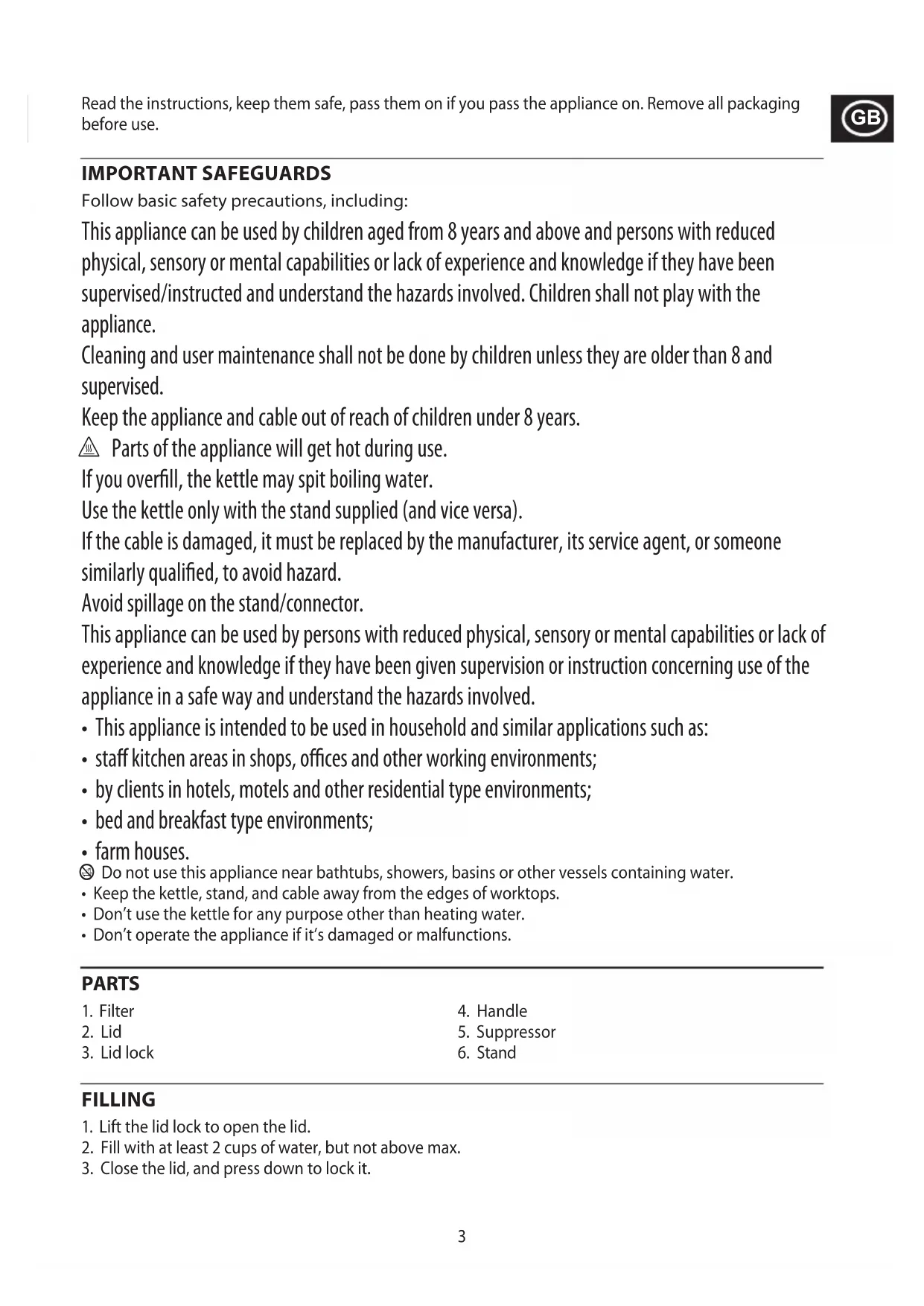 h b3 Read the instructions, keep them safe, pass them on if you pass the appliance on. Remove all packaging before use. IMPORTANT SAFEGUARDS Follow basic safety precautions, including: This appliance can be used by children aged from 8 years and above and persons with reduced physical, sensory or mental capabilities or lack of experience and knowledge if they have been supervised/instructed and understand the hazards involved. Children shall not play with the appliance. Cleaning and user maintenance shall not be done by children unless they are older than 8 and supervised. Keep the appliance and cable out of reach of children under 8 years. h Parts of the appliance will get hot during use. If you overfill, the kettle may spit boiling water. Use the kettle only with the stand supplied (and vice versa). If the cable is damaged, it must be replaced by the manufacturer, its service agent, or someone similarly qualified, to avoid hazard. Avoid spillage on the stand/connector. This appliance can be used by persons with reduced physical, sensory or mental capabilities or lack of experience and knowledge if they have been given supervision or instruction concerning use of the appliance in a safe way and understand the hazards involved.