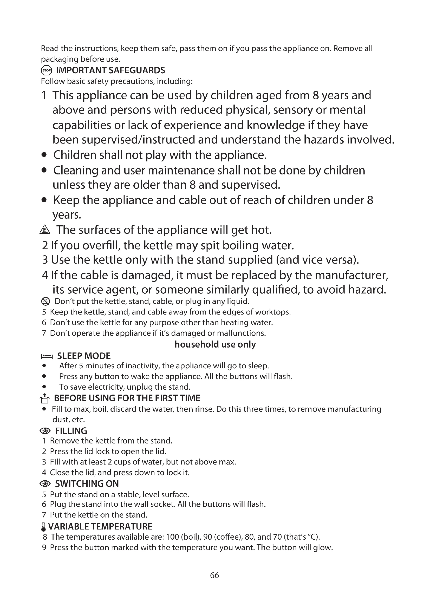 - Keep the appliance and cable out of reach of children under 8 years. ¬ The surfaces of the appliance will get hot. 2 If you overfill, the kettle may spit boiling water. 3 Use the kettle only with the stand supplied (and vice versa). 4 If the cable is damaged, it must be replaced by the manufacturer, its service agent, or someone similarly qualified, to avoid hazard. H Don’t put the kettle, stand, cable, or plug in any liquid. 5 Keep the kettle, stand, and cable away from the edges of worktops. 6 Don’t use the kettle for any purpose other than heating water. 7 Don’t operate the appliance if it’s damaged or malfunctions. household use only