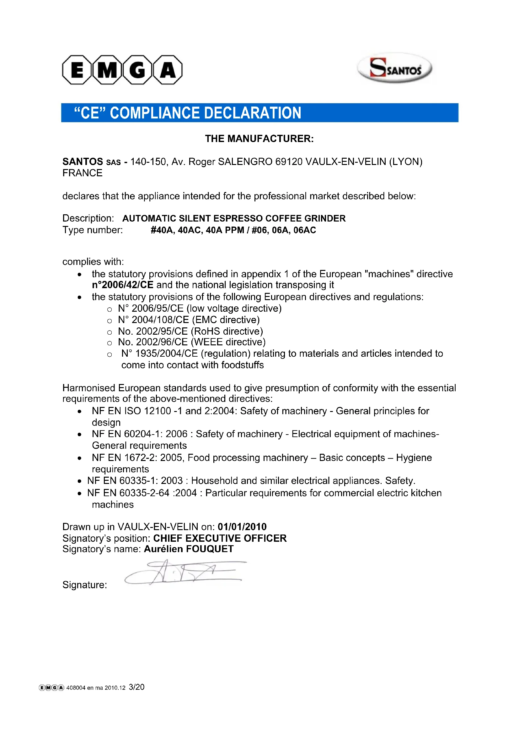 THE MANUFACTURER: SANTOS SAS - 140-150, Av. Roger SALENGRO 69120 VAULX-EN-VELIN (LYON) FRANCE declares that the appliance intended for the professional market described below: Description: AUTOMATIC SILENT ESPRESSO COFFEE GRINDER Type number: #40A, 40AC, 40A PPM / #06, 06A, 06AC complies with: the statutory provisions defined in appendix 1 of the European "machines" directive n°2006/42/CE and the national legislation transposing it the statutory provisions of the following European directives and regulations: o N° 2006/95/CE (low voltage directive) o N° 2004/108/CE (EMC directive) o No. 2002/95/CE (RoHS directive) o No. 2002/96/CE (WEEE directive) o N° 1935/2004/CE (regulation) relating to materials and articles intended to come into contact with foodstuffs Harmonised European standards used to give presumption of conformity with the essential requirements of the above-mentioned directives: NF EN ISO 12100 -1 and 2:2004: Safety of machinery - General principles for design NF EN 60204-1: 2006 : Safety of machinery - Electrical equipment of machines- General requirements NF EN 1672-2: 2005, Food processing machinery – Basic concepts – Hygiene requirements NF EN 60335-1: 2003 : Household and similar electrical appliances. Safety. NF EN 60335-2-64 :2004 : Particular requirements for commercial electric kitchen machines Drawn up in VAULX-EN-VELIN on: 01/01/2010 Signatory’s position: CHIEF EXECUTIVE OFFICER Signatory’s name: Aurélien FOUQUET Signature: 408004 en ma 2010.12 3/2098140 US 3.4 - 12 2010 4 / 20 www.santos.fr IMPORTANT SAFEGUARDS When using, cleaning or maintaining the machine, always follow these instructions: Read all instructions IMPROPER USE