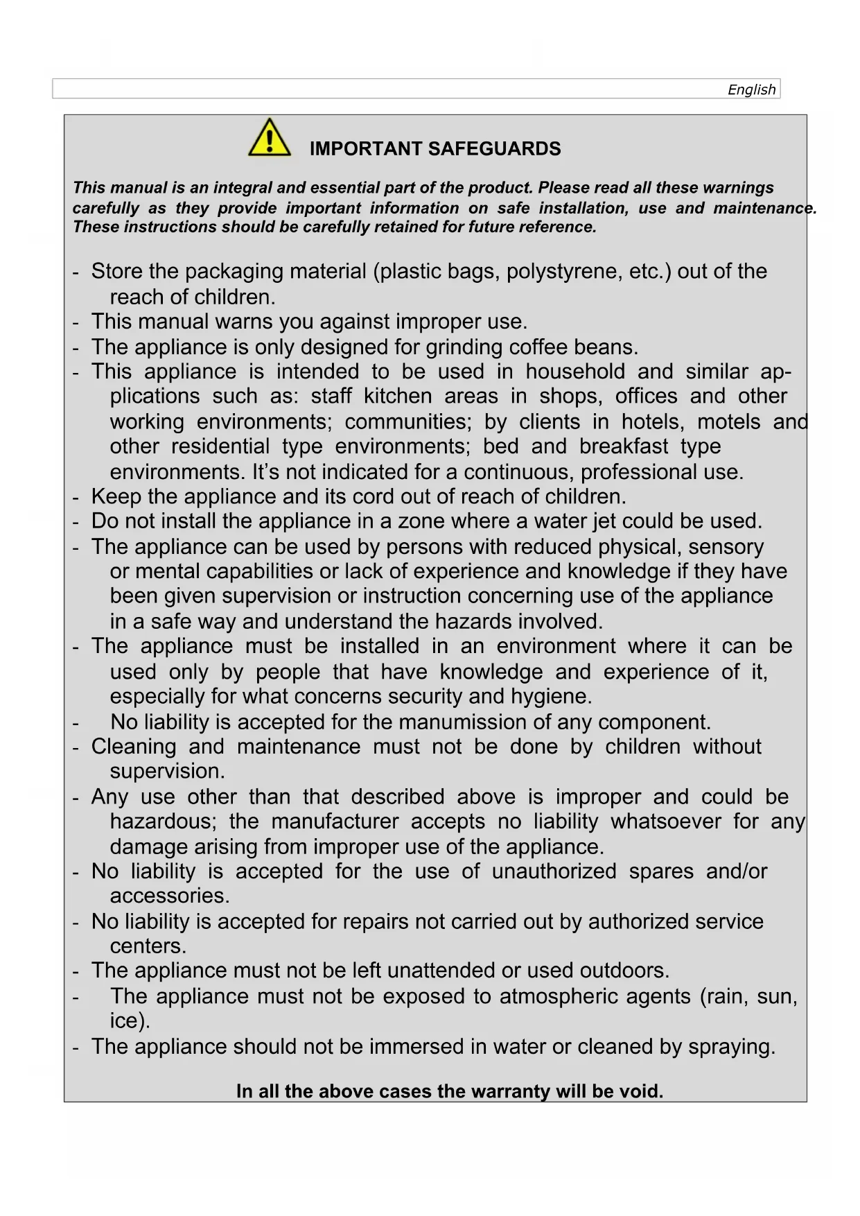 IMPORTANT SAFEGUARDS This manual is an integral and essential part of the product. Please read all these warnings carefully as they provide important information on safe installation, use and maintenance. These instructions should be carefully retained for future reference. - Store the packaging material (plastic bags, polystyrene, etc.) out of the reach of children. - This manual warns you against improper use. - The appliance is only designed for grinding coffee beans. - This appliance is intended to be used in household and similar ap- plications such as: staff kitchen areas in shops, offices and other working environments; communities; by clients in hotels, motels and other residential type environments; bed and breakfast type environments. It’s not indicated for a continuous, professional use. - Keep the appliance and its cord out of reach of children. - Do not install the appliance in a zone where a water jet could be used. - The appliance can be used by persons with reduced physical, sensory or mental capabilities or lack of experience and knowledge if they have been given supervision or instruction concerning use of the appliance in a safe way and understand the hazards involved. - The appliance must be installed in an environment where it can be used only by people that have knowledge and experience of it, especially for what concerns security and hygiene. - No liability is accepted for the manumission of any component. - Cleaning and maintenance must not be done by children without supervision. - Any use other than that described above is improper and could be hazardous; the manufacturer accepts no liability whatsoever for any damage arising from improper use of the appliance. - No liability is accepted for the use of unauthorized spares and/or accessories. - No liability is accepted for repairs not carried out by authorized service centers. - The appliance must not be left unattended or used outdoors. - The appliance must not be exposed to atmospheric agents (rain, sun, ice). - The appliance should not be immersed in water or cleaned by spraying.