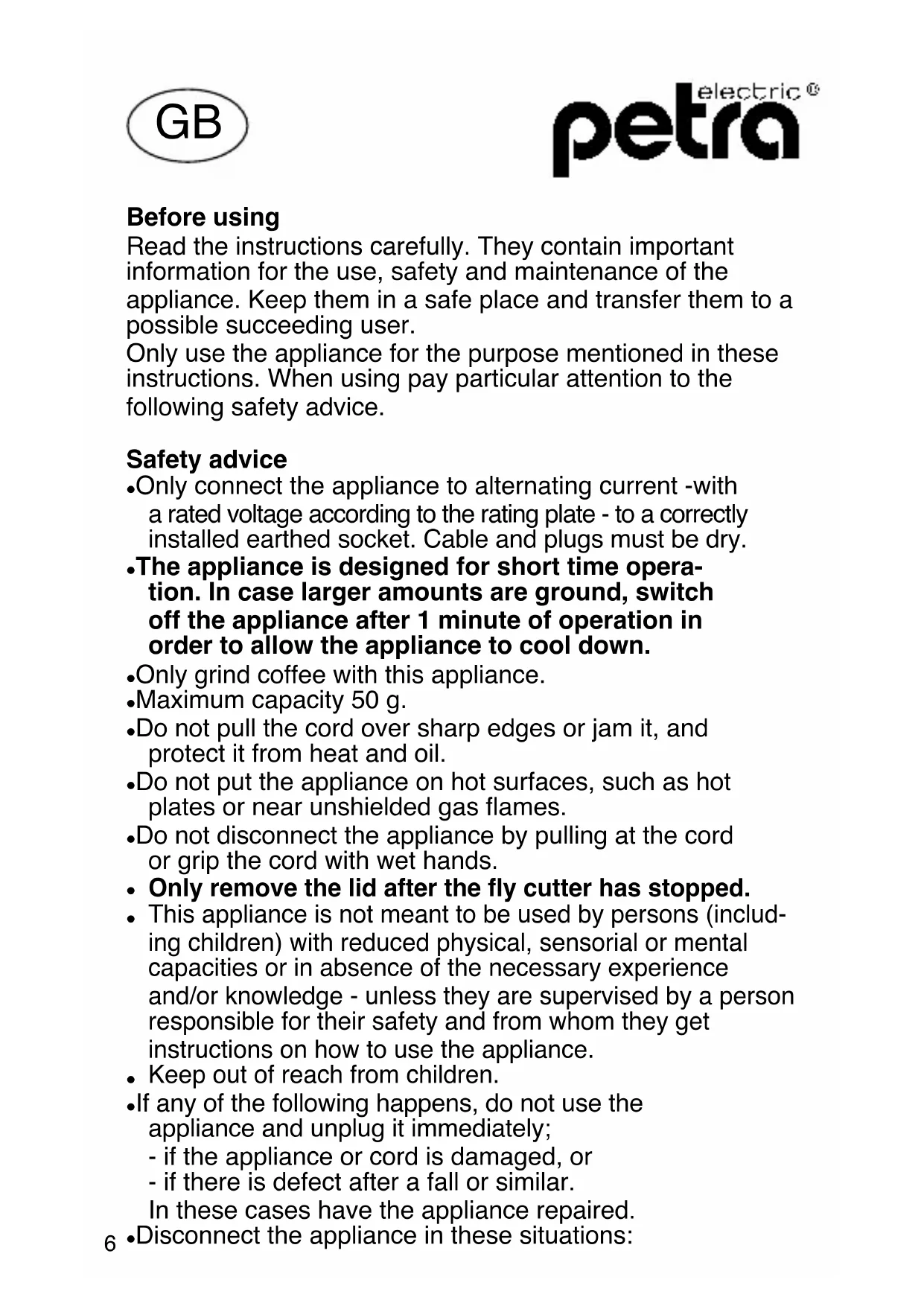 CEBefore using Read the instructions carefully. They contain important information for the use, safety and maintenance of the appliance. Keep them in a safe place and transfer them to a possible succeeding user. Only use the appliance for the purpose mentioned in these instructions. When using pay particular attention to the following safety advice. Safety advice Only connect the appliance to alternating current -with a rated voltage according to the rating plate - to a correctly installed earthed socket. Cable and plugs must be dry. The appliance is designed for short time opera- tion. In case larger amounts are ground, switch off the appliance after 1 minute of operation in order to allow the appliance to cool down. Only grind coffee with this appliance. Maximum capacity 50 g. Do not pull the cord over sharp edges or jam it, and protect it from heat and oil. Do not put the appliance on hot surfaces, such as hot plates or near unshielded gas flames. Do not disconnect the appliance by pulling at the cord or grip the cord with wet hands.
