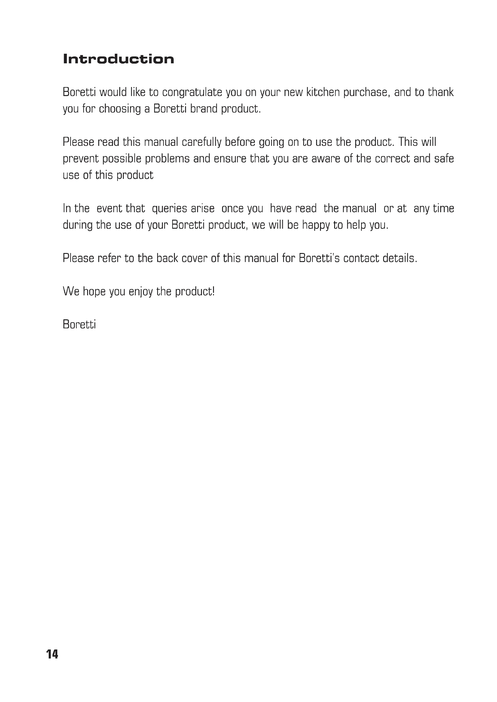 standards of the cleaning of the cooker hood and replacement of the filters may cause fire risks. Therefore we recommend observing these instructions. Anti-grease Filter The anti-grease filter must be cleaned with non abrasive detergents by hand, or in dishwasher on low temperature and short cycle. When washed in a dishwasher, the grease filter may discolour slightly, but this does not affect its filtering capacity. Charcoal Filter - (only for filter version) The active charcoal filters are not washable nor regenerative. Replacing light bulbs Warning! Prior to touching the light bulbs en- sure they are cooled down. Extract the lamp cover by levering it off with a small screwdriver or similar tool. Replace the damaged light bulb. Only use halogen bulbs of 20W max, making sure you do not touch them with your hands. Close the lamp cover (it will snap shut). Caution This appliance is designed to be operated by adults. Children should not be allowed to tam- per with the controls or play with the appli- ance. Do not use the cooker hood where the grill is not correctly fixed! The suctioned air must not be conveyed in the same channel used for fumes discharged by appliances powered by other than electricity. The environment must always be adequately aerated when the cooker hood and other appliances powered by other than electricity are used at the same time. Flambé cooking with a cooker hood is prohibi- ted. The use of a free flame is damaging to the filters and may cause fire accidents, therefore free flame cooking must be avoided. Frying of foods must be kept under close control in or- der to avoid overheated oil catching fire. Carry out fumes discharging in accordance with the regulations in force by local laws for safety and technical restrictions.334BORET T I B.V. De Dollard 17 1454 AT Watergang T +31(0) 20-4363 439 F + 31(0) 20-4361326 S 0900-2352673 (ser v ice) E info @ boretti.com The Netherlands N.V. B O R E T T I S. A. Ruperlweg 16 2850 Boom T + 32 (0) 3-4508180 F + 32 (0) 3-4586847 E info @ boretti.com Belgium BOR E T TI S.L . Oficina en Avd. de la Barrosa 63c 11139 Chiclana de la Fr ontera (Cadiz) T +34 956 494684 F + 34 956 494150 E info @ boret ti.com Spain