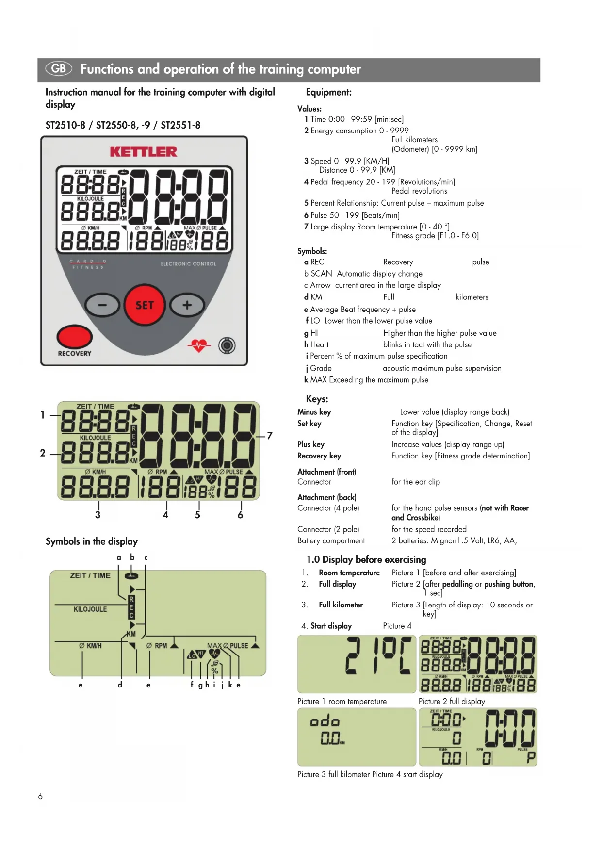 Datum Belastungsstufe Entfernung Zeit P1 P2 Fitness- (km) (min) Note6 Equipment: Values: 1 Time 0:00 - 99:59 [min:sec] 2 Energy consumption 0 - 9999 Full kilometers (Odometer) [0 - 9999 km] 3 Speed 0 - 99.9 [KM/H] Distance 0 - 99,9 [KM] 4 Pedal frequency 20 - 199 [Revolutions/min] Pedal revolutions 5 Percent Relationship: Current pulse – maximum pulse 6 Pulse 50 - 199 [Beats/min] 7 Large display Room temperature [0 - 40 °] Fitness grade [F1.0 - F6.0] Symbols: a REC Recovery pulse b SCAN Automatic display change c Arrow current area in the large display d KM Full kilometers e Average Beat frequency + pulse f LO Lower than the lower pulse value g HI Higher than the higher pulse value h Heart blinks in tact with the pulse i Percent % of maximum pulse specification j Grade acoustic maximum pulse supervision k MAX Exceeding the maximum pulse Keys: Minus key Lower value (display range back) Set key Function key [Specification, Change, Reset of the display] Plus key Increase values (display range up) Recovery key Function key [Fitness grade determination] Attachment (front) Connector for the ear clip Attachment (back) Connector (4 pole) for the hand pulse sensors (not with Racer and Crossbike) Connector (2 pole) for the speed recorded Battery compartment 2 batteries: Mignon1.5 Volt, LR6, AA,